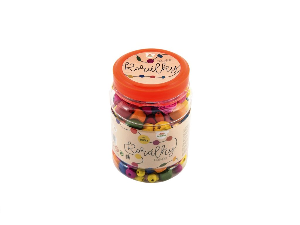 Dětské barevné korálky pro malé parádnice a nejen pro ně. V sadě najdete různé druhy a tvary korálků, které mají pestré a veselé barvy. Součástí jsou gumičky, na které si děti mohou navlékat korálky dle své fantazie, náramky a řetízky, které jsou poté roztahovací. Vzniknou tak jedinečné módní doplňky. Plastová dóza obsahuje cca 300 ks korálků. Dřevěné korálky jsou vhodnou hračkou pro rozvoj dětské motoriky, trpělivosti i fantazie.Rozměry balení 7 x 11 x 7 cm.