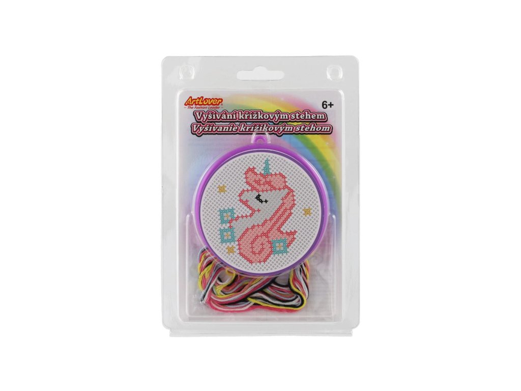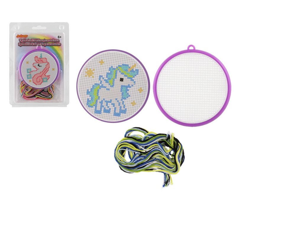 Vyšívání křížkovým stehem jednorožec vyšívací rámeček 1 předloha 6 bavlnek v blistru 12,5x18x1cm