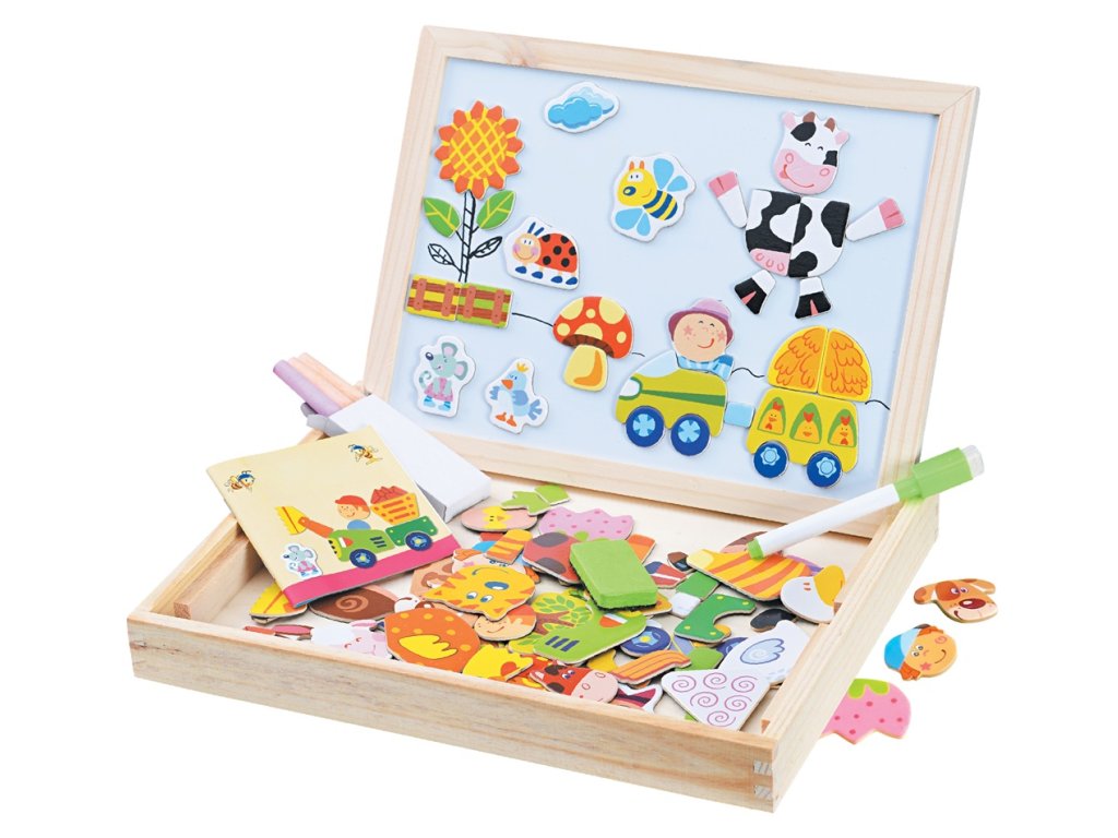 Objevte kouzlo venkova s kreativní magnetickou sadou! Magnetická tabulka je oboustranně využitelná. Na bílou magnetickou stranu lze psát fixem a přichytávat tematické postavičky, zvířátka, květiny a všechno, co je spojeno s životem na farmě. Na břidlicovou stranu se píše křídou, kterou lze snadno smazat pomocí plstěné houbičky na fixu. Děti mohou tvořit podle přiložené předlohy nebo si mohou sestavovat vlastní farmářské příběhy. Učí se, jak to na farmě chodí, poznávají tvary a barvy a rozvíjejí fantazii i jemnou motoriku. Všechny části jsou uloženy v dřevěné krabičce, která je lehce přenosná.