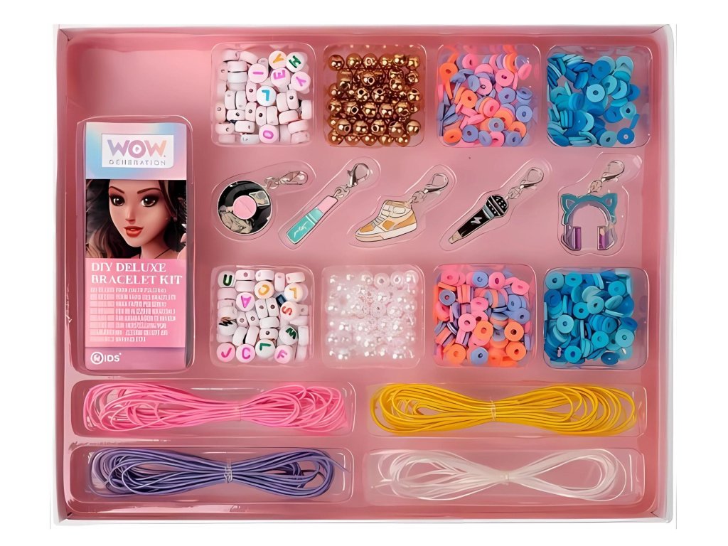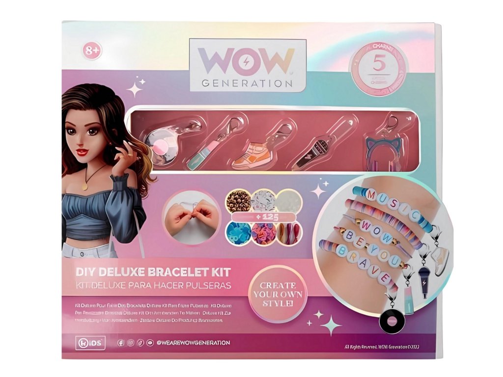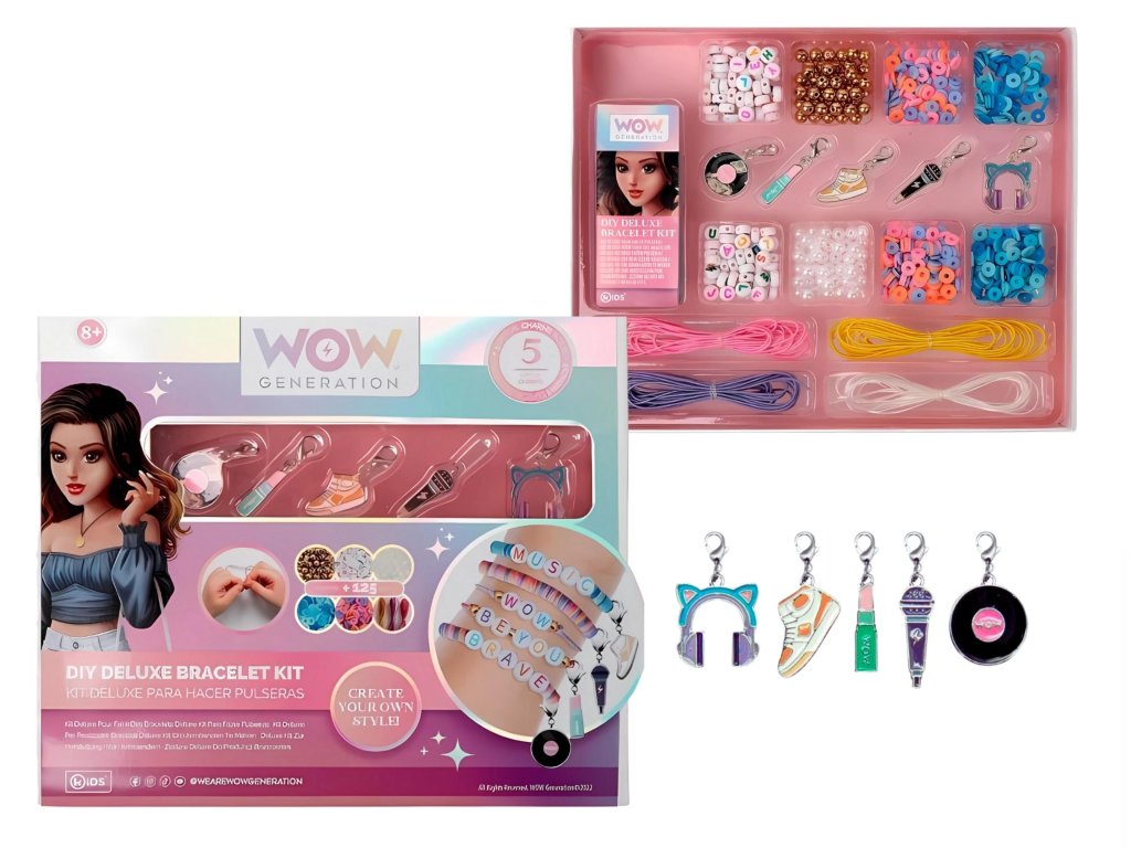 Sada na výrobu náramků WOW Generation DIY Deluxe Bracelet Kit. Obsah sady: Sada obsahuje 5 kovových přívěsků (např. mikrofon, sluchátka, rtěnka, pantofel, vinylová deska), přes 100 různých korálků včetně písmenkových korálků v různých barvách (bílé, zlaté, růžové, fialové, oranžové, modré) a čtyři různé šňůrky. Věk: Sada je určena pro děti od 8 let. Účel: Umožňuje dětem vytvářet vlastní personalizované náramky s unikátními designy a přívěsky. Kreativita: Podporuje kreativitu a rozvíjí jemnou motoriku. Deluxe sada na výrobu 5 náramků. Rozměry balení: 21,5 x 18 cm. Pro děti od 8 let. Výrobce: Euroswan. Kids Euroswan. S.L. Victor Hugo 4 08174 Sant Cugat del Valles Tl. 0+4938825460Doplňkové parametry