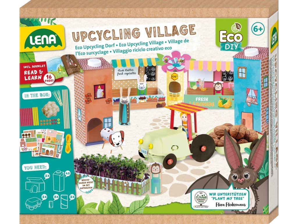Recykluj místo vyhazováníTo je myšlenka zprostředkovaná souborem okouzlujících grafik, které promění starý obalový materiál v malou vesnici se stánky na trhu, bylinkovou zahrádkou, domy a traktorem