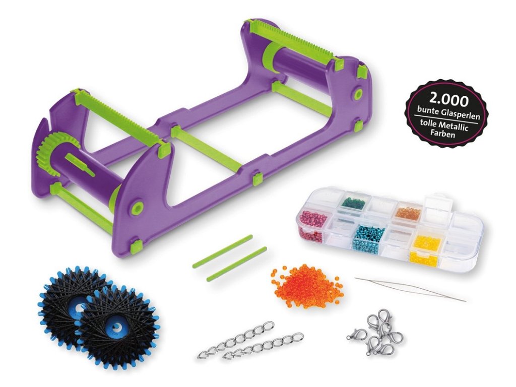 Sada obsahuje vše potřebné pro vytvoření originálních náramků: od kvalitních skleněných korálků v šesti různých barvách, přes rám na tkaní až po jehlu s velkým očkem