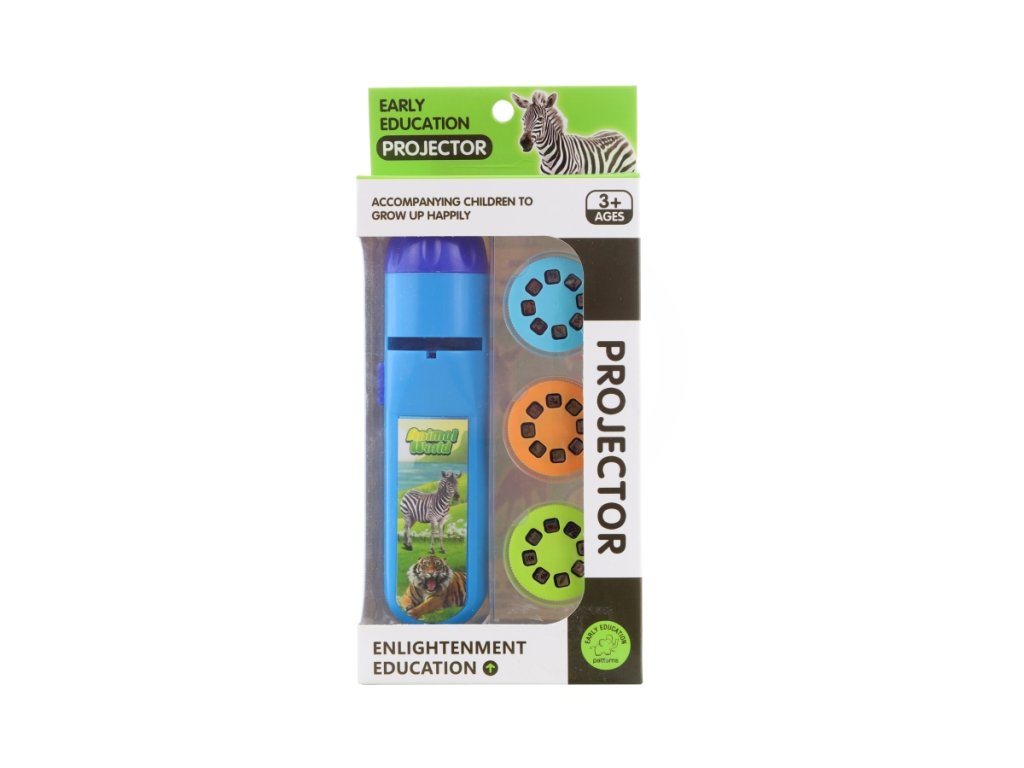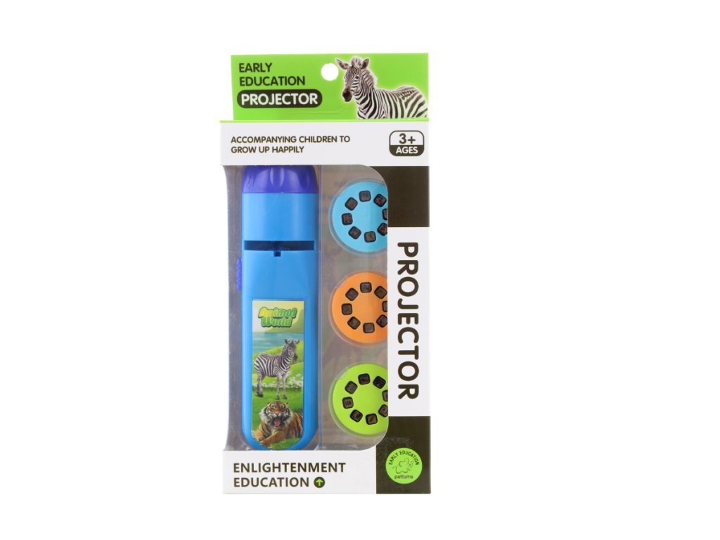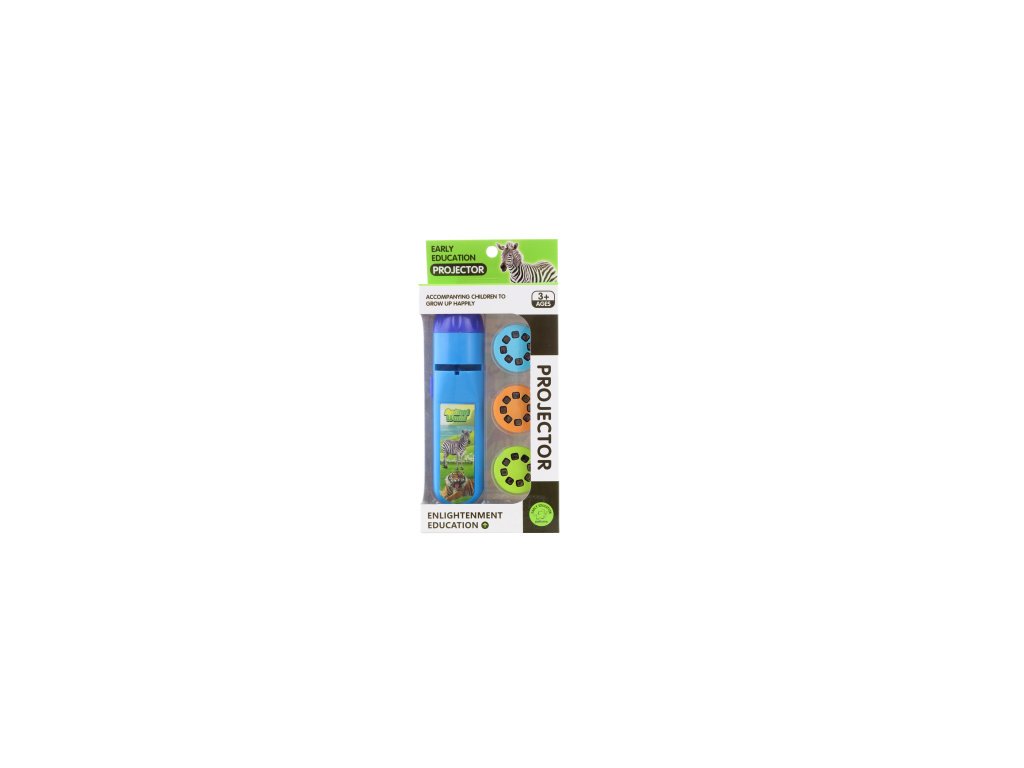 Plastový projektor na baterie. Součástí jsou 3 kotoučky s obrázky (celkem 24 obrázků). Po stisknutí tlačítka projektor promítá obrázky na zeď (nebo jinou bílou plochu). Napájení na 3 AG13 baterie (jsou součástí). Rozměry projektoru cca 13 x 3,5 cm. Rozměry balení cca 9,5x20,5x4 cm. Věk 3+Doplňkové parametry