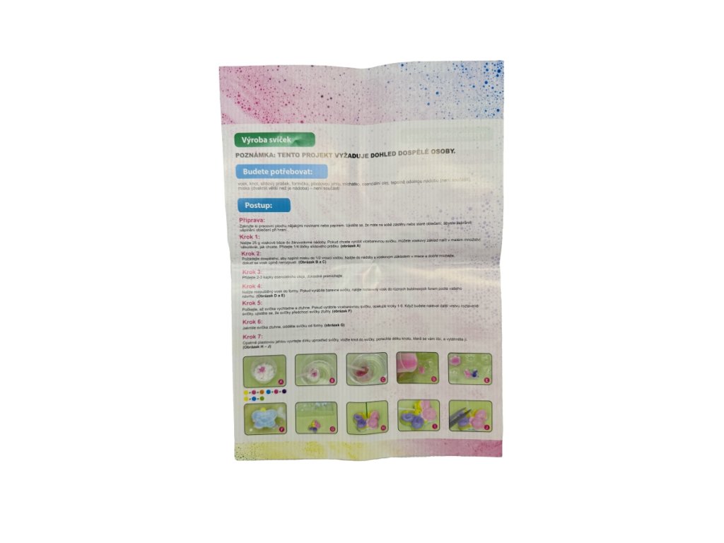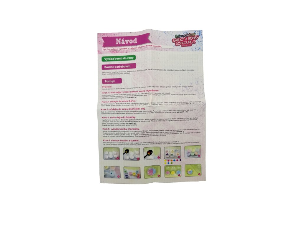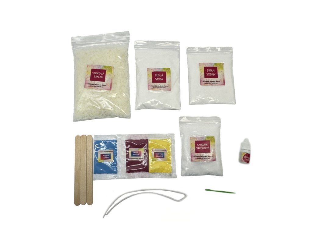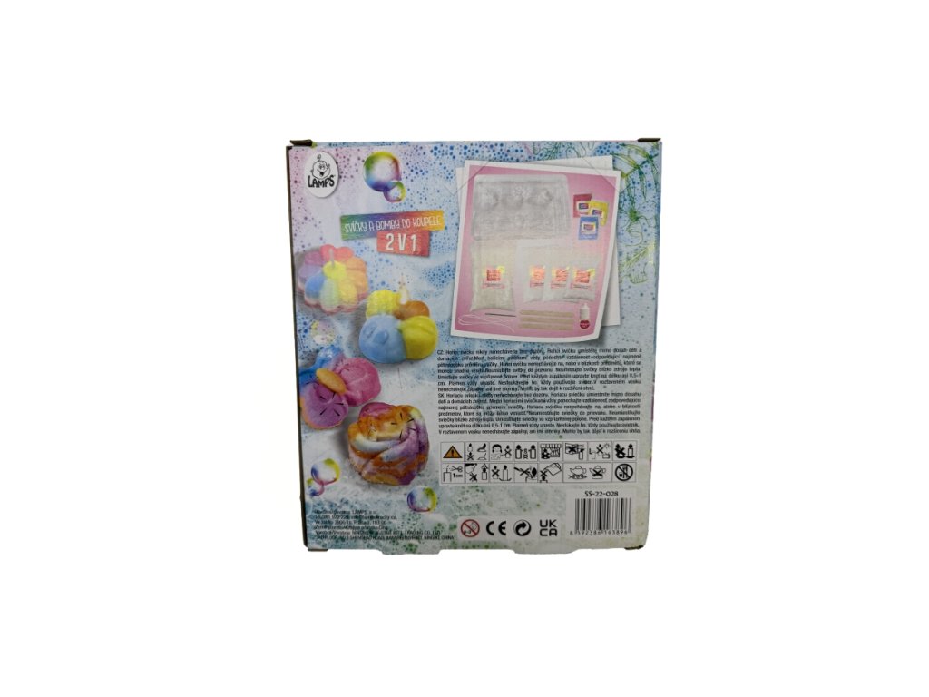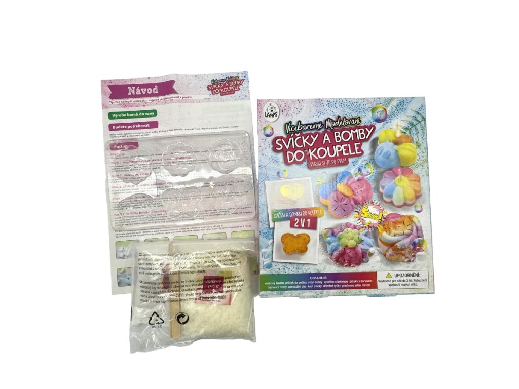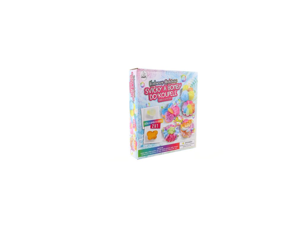 Vyrobte si své svýčky a bomby do koupele. Balení obsahuje vše potřebné: voskový základ, prášek do pečiva, síran sodný, kyselinu citrónovou, barvivo, tvarovací formy, esenciální olej, knot, dřevěné tyčky, jehlu a návod. Rozměr balení 20 x 23 x 5 cm. Věk 3+.Doplňkové parametry