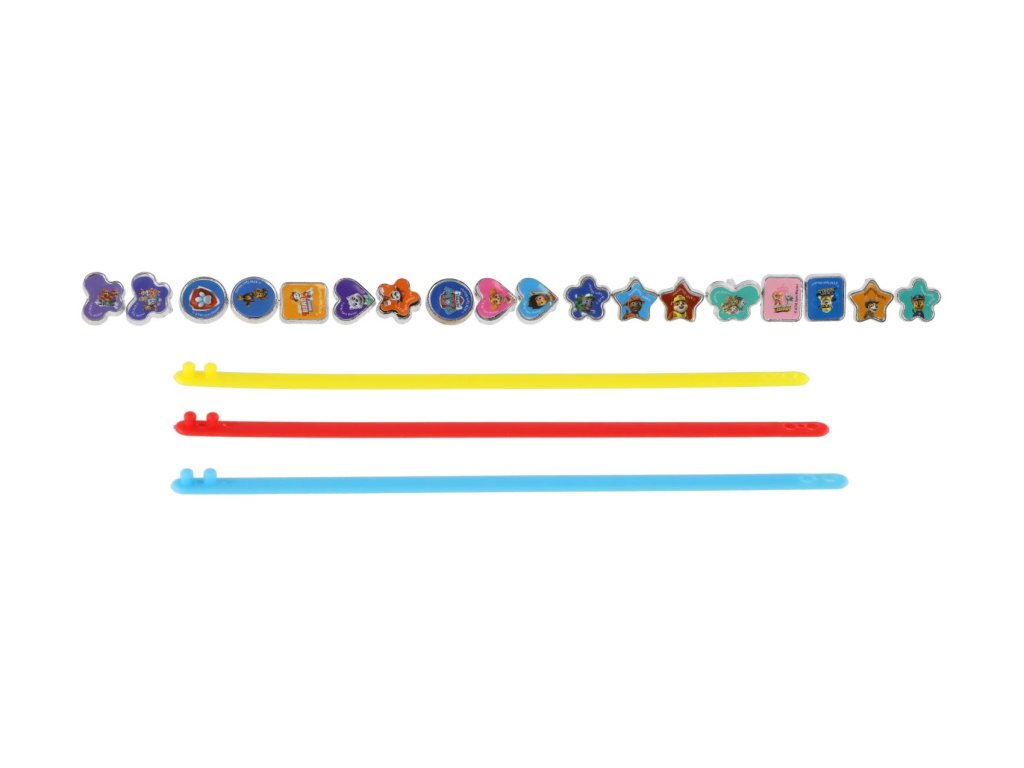 Balení obsahuje tři silikonové náramky (žlutý, růžový, fialový), 18 ks různých druhů doplňků. Vyrobit náramky s motivem Tlapkové patroly zvládnou i nejmenší děti.Rozměry balení 15 x 21 x 3 cm.
