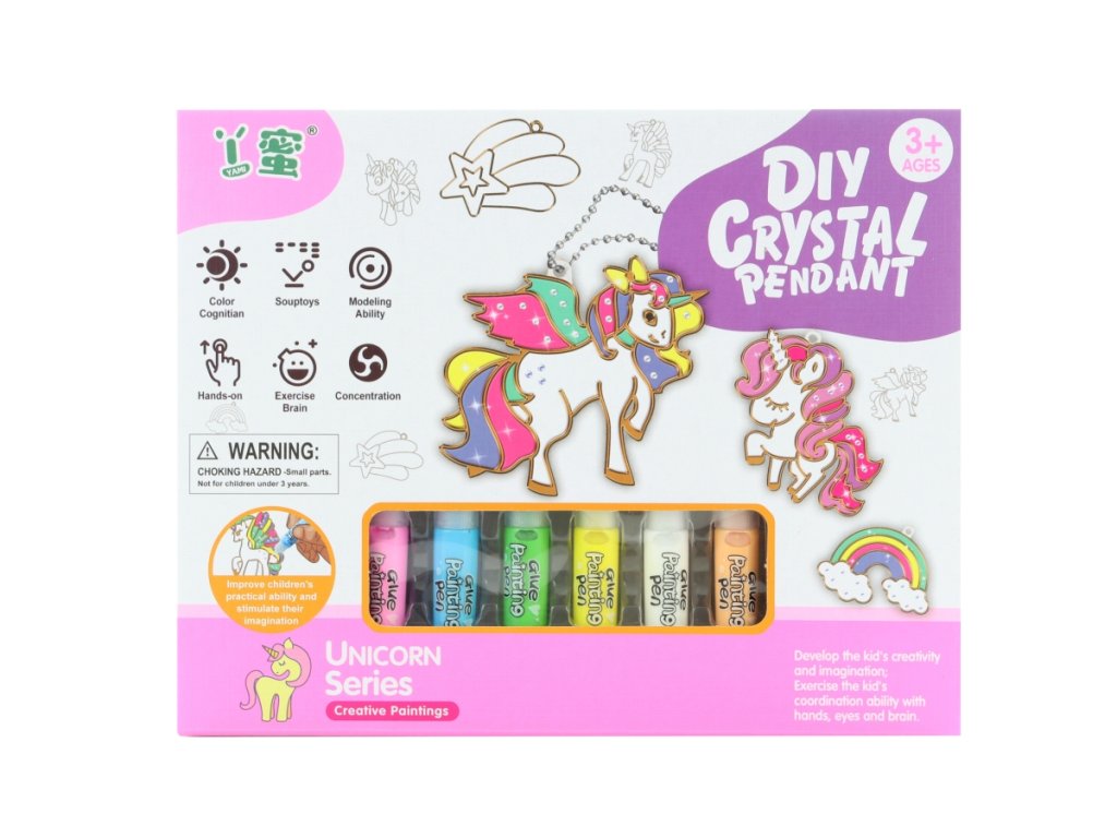 Kreativní sada-výroba přívěšků s motivem jednorožců. Balení obsahuje 6 přívěšků k dozdobení, 6 barviček, pinzetu, třpytky a šňůrky. Materiál plast. Baleno v krabici. Rozměry balení cca 24,5x19,5x4 cm. Velikost přívěšku cca 6-7 cm. Věk 3+Doplňkové parametry