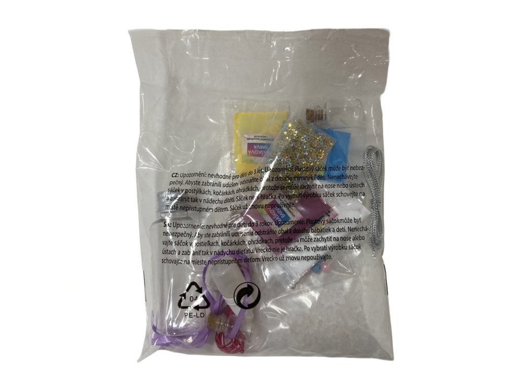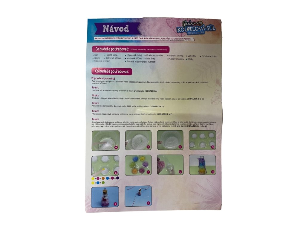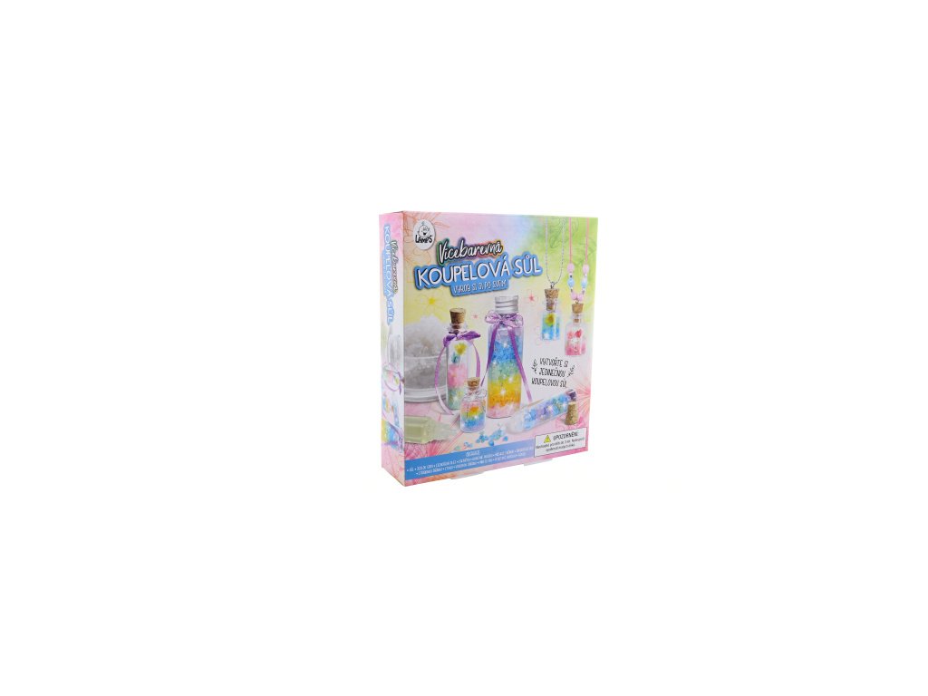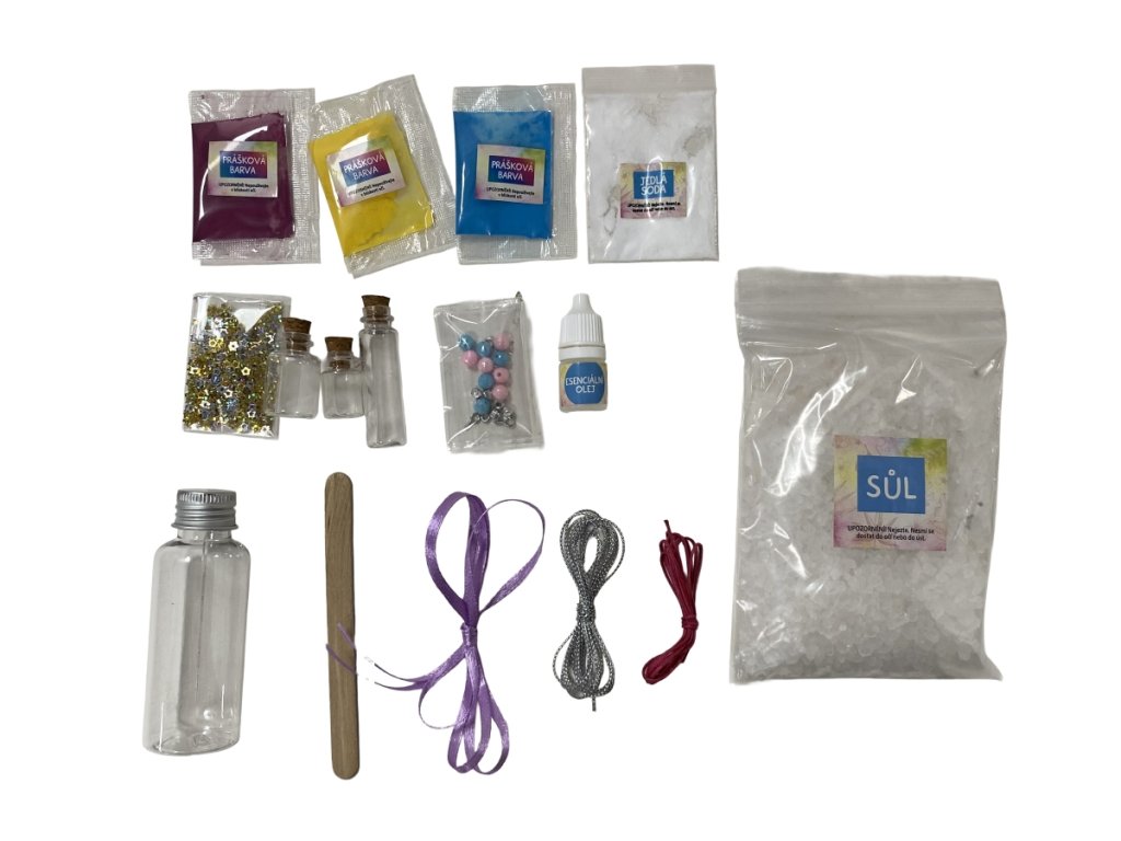 Kreativní sada výroba koupelové soli. Vytvořte si jedinečnou koupelovou sůl. Balení obsahuje sůl, jedlou sodu, esenciální olej, lahvičky, barevné prášky, míchací tyčinky, šroubovací oka, stříbrnou šňůrku, stuhu, voskovou šňůrku, mini filtry, plastové korálky a návod. Baleno v krabici. Rozměry balení 20x23x5 cm. Věk 3+Doplňkové parametry