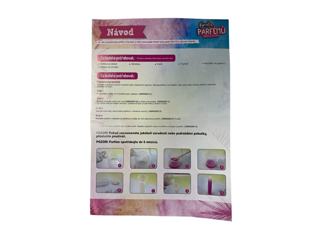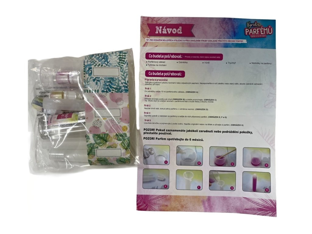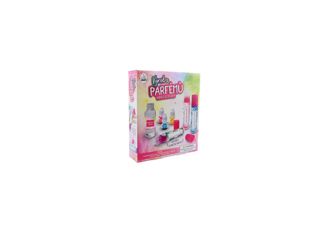 Kreativní sada výroba parfému. Vytvořte si jedinečný parfém. Balení obsahuje lahvičku parfémovaného základu, 3 nádobky na parfémy, 3 lahvičky vůní, trychtýř, odměrku, 3 samolepky a návod. Baleno v krabici. Rozměry balení 20x23x5 cm. Věk 3+Doplňkové parametry