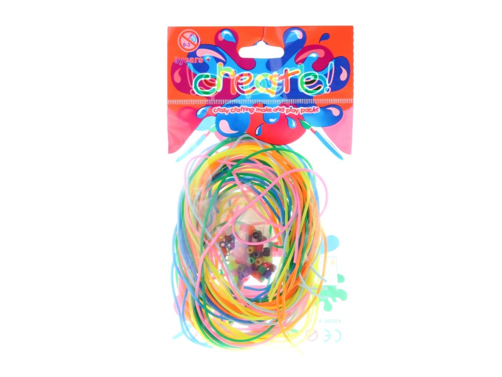 Kreativní sada k výrobě náramků a doplňků. Sada obsahuje gumové struny a plastové doplňky. Baleno v sáčku. Rozměry balení 13x22x1cm. Věk 3+Doplňkové parametry