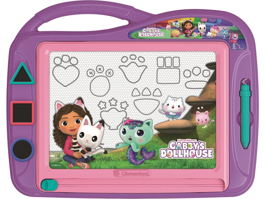 Popis: Tato magnetická tabulka umožňuje dětem opakovaně kreslit a mazat obrázky pomocí speciální tužky a posuvné páčky. Je navržena s oblíbeným motivem z animovaného seriálu "Gábinin kouzelný domek" (Gabby's Dollhouse).