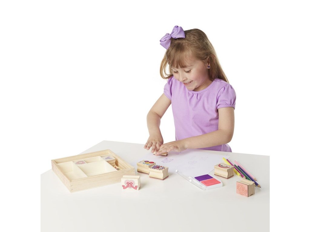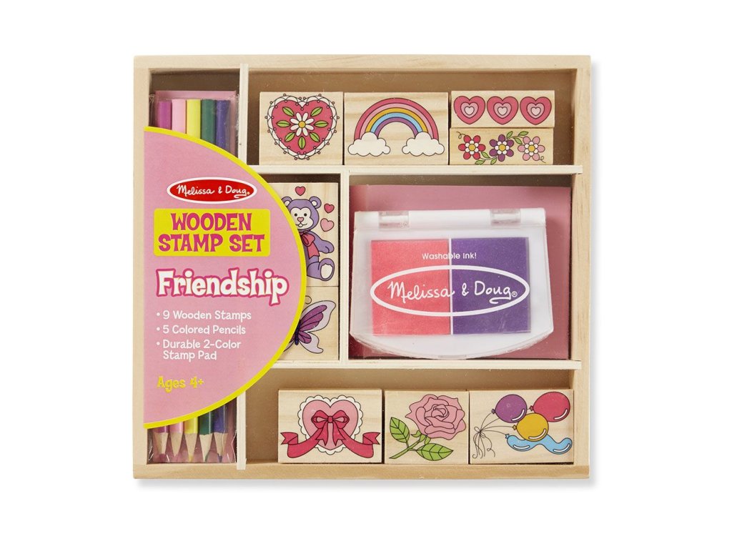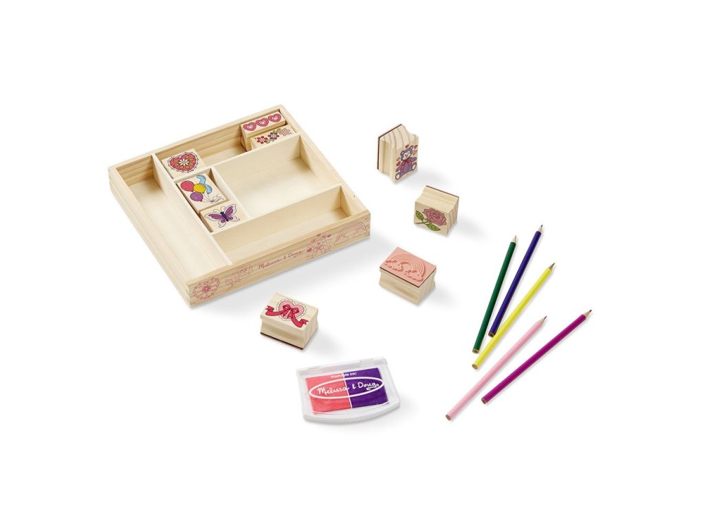 Dřevěná razítka v krabici.Paleta 9 razítek se srdíčky, duhou, medvídkem, kětinkami, balónky i srdíčkem, 2 polštářky barvy oranžové a modré, 5 barevných pastelek v dřevěném pouzdře.