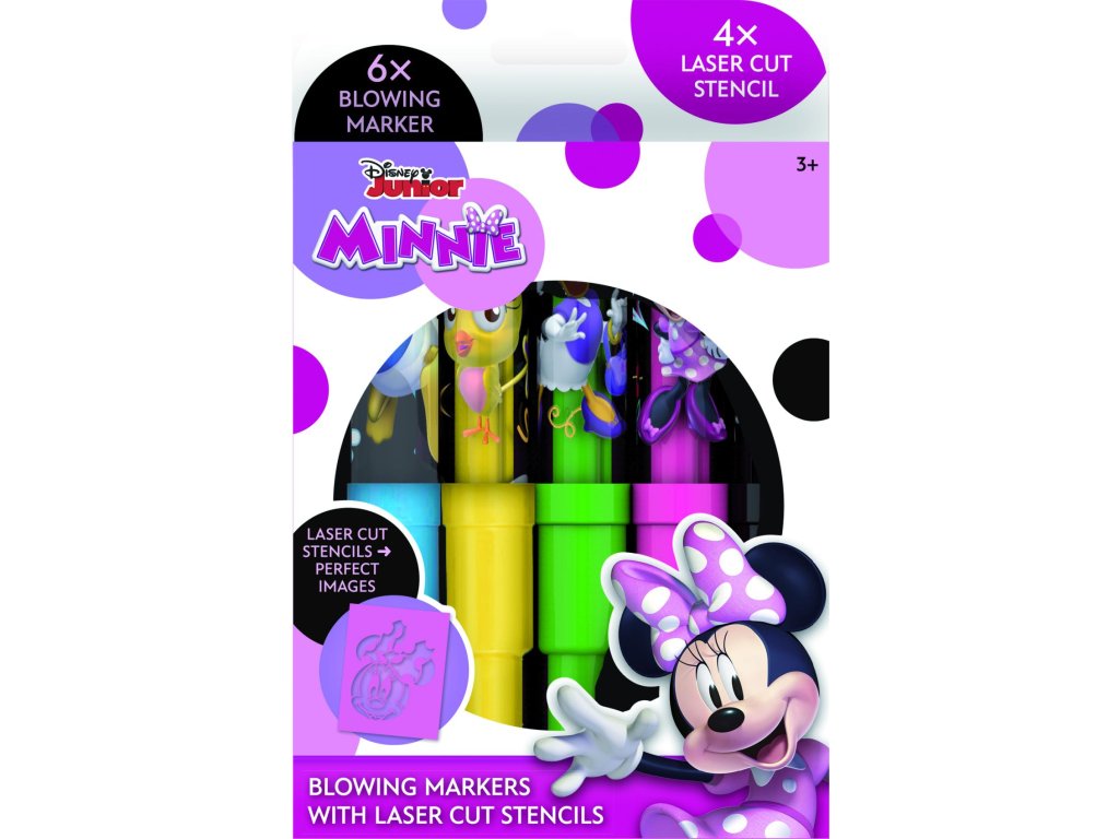 Objevte kouzlo tvoření našimi foukacími fixami! Syté odstíny fix s motivem minnie si zamiluje každé dítě. Balení obsahuje 6 barevných foukacích fix s potiskem a 4 barevné papírové šablonky v oblíbených pohádkových motivech.Rozměr balení: 12 x 19 cm