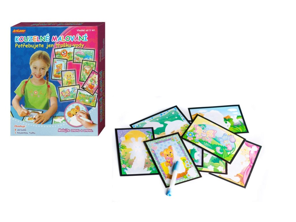 Sada obsahuje 8 kouzelných obrázků. Do tužky nalijte vodu a malujete s ní na obrázek, obrázek se po použití vody objeví a až voda zaschne -cca 3 minuty zase zmizí a můžete malovat znovu. Menší děti mohou používat obyčejný štětec a kelímek s vodou- je to pro ně opravdu zábava a pro rodiče také, protože vodou se nic neušpiní jako s barvami...Vhodné pro děti již od 3 let.Doplňkové parametry