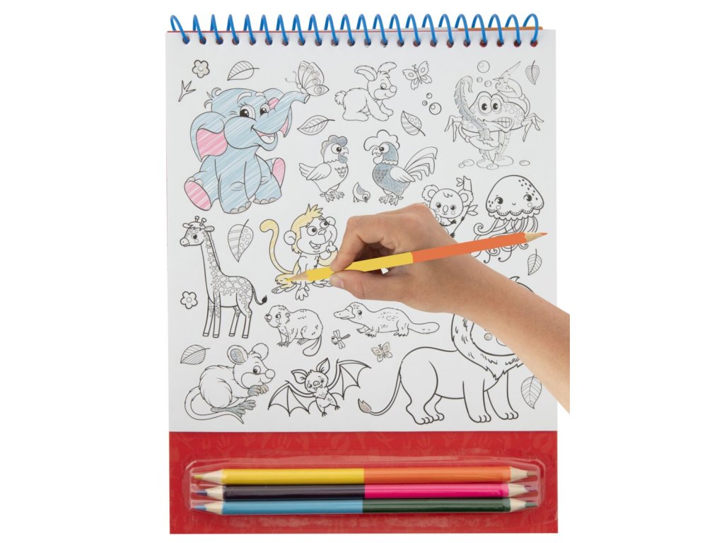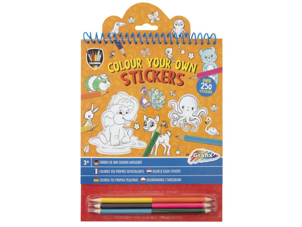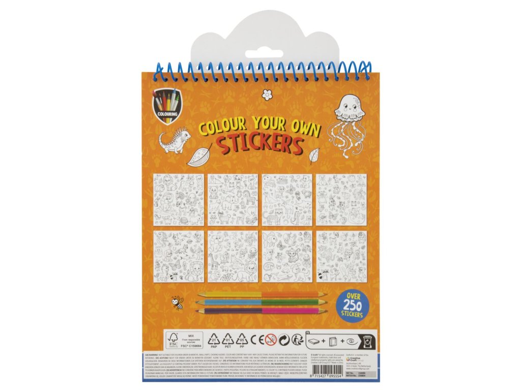 Kreativní set vymaluj si své samolepky ve formě kroužkového bloku obsahuje 8 listů samolepek k vymalování a 3 oboustranné pastelky (6 barev), vybarvi a nalep!