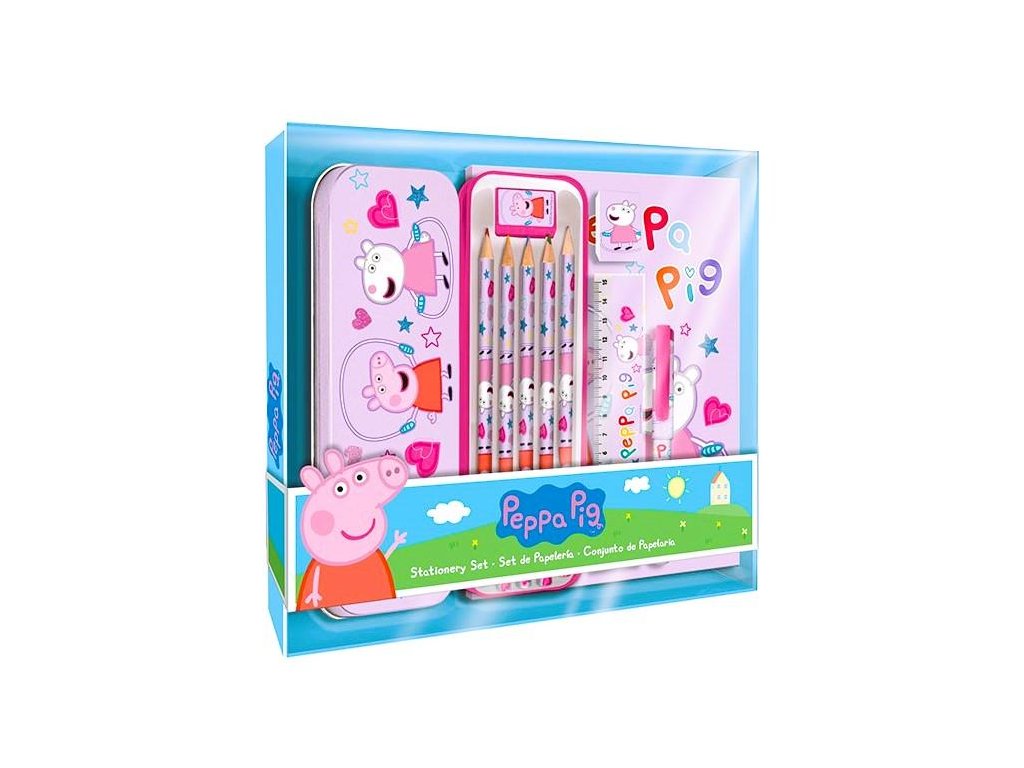 Dárková kreslící sada s motivem Prasátko Peppa Pig. Obsahuje: malý linkovaný zápisník kovový penál pravítko gumu ořezávátko kuličkové pero 5 pastelek Rozměr balení: 24 x 24 x 3 cm. Pro děti od 3 let. Oficiální licence, Euroswan. Kids Euroswan. S.L. Victor Hugo 4 08174 Sant Cugat del Valles Tl. 0+4938825460Doplňkové parametry