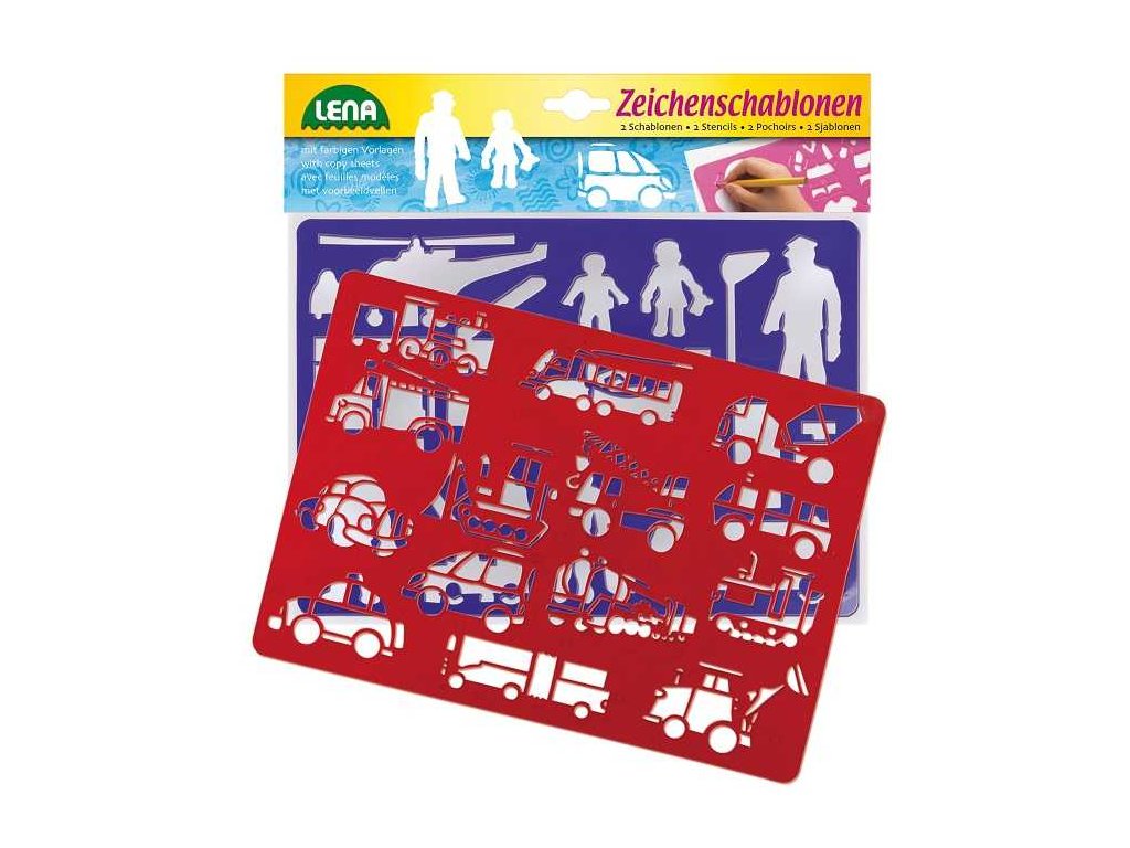 Kreslící šablonky s motivem dopravních prostředků a lidí. Balení obsahuje 2x šablonku o velikosti 27x23cm.