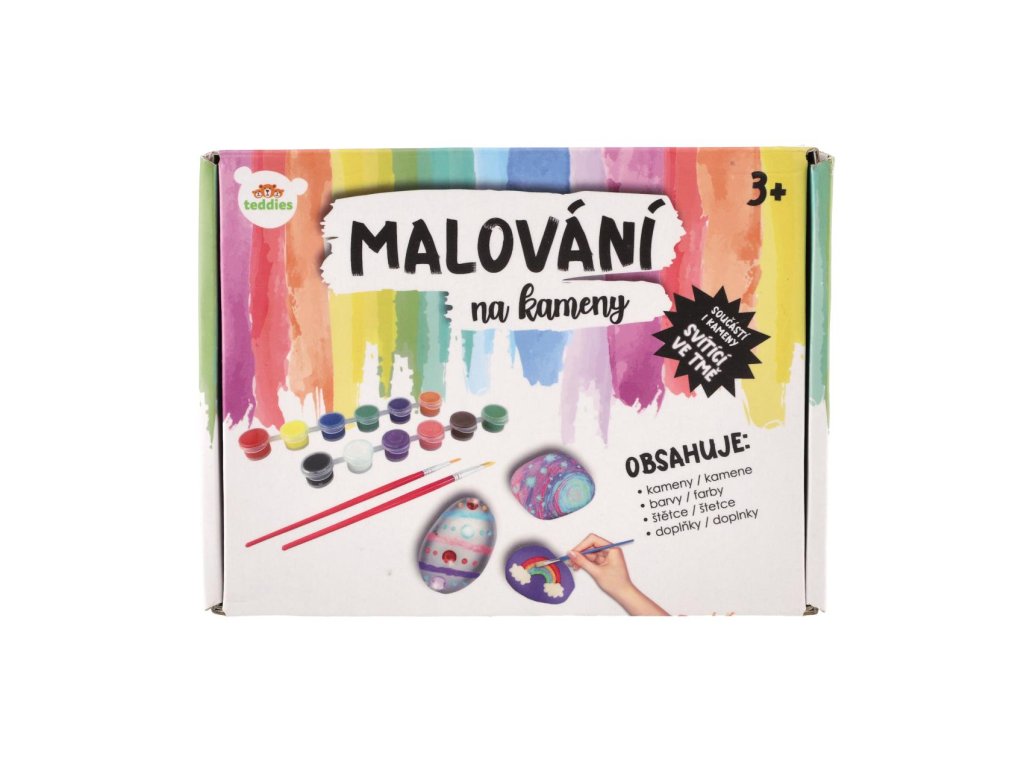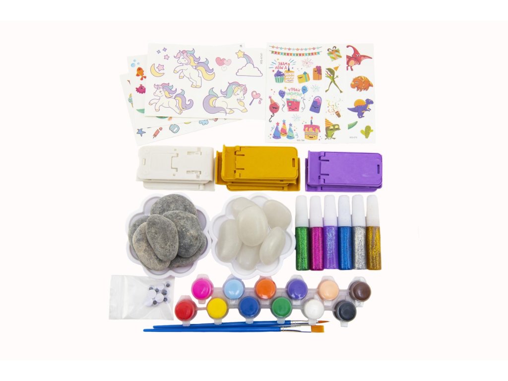 Zábavné zdobení kamenů, které zabaví najen děti, ale i dospělé. Pokud kamínky z balení dojdou v přírodě jich na vás čeká dost. Vynikající hračka pro rozvoj manuální zručnosti. Vše potřebné k výrobě najdete uvnitř balení. Balení obsahuje: 12 kamenů (z toho 6 svítících), 6x glitrové lepidlo, 12x barvy v uzavíratelných kelímkách, samolepky, palety na míchání barev, štětce, pohyblivé oči, stojánky pro malování kamenů.Rozměry balení 20 x 15 x 5 cm