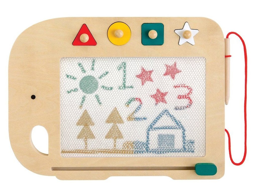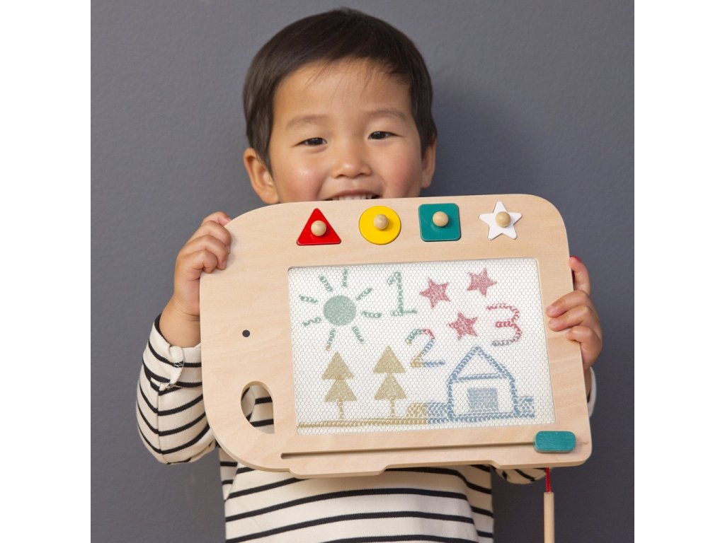 Designová dřevěná magnetická kreslící tabulkaDítě může psát nebo kreslit s tužkou pevně připojenou na provázku a pomocí čtyř tvarovaných magnetických razítek vytvářet vzory a tvary