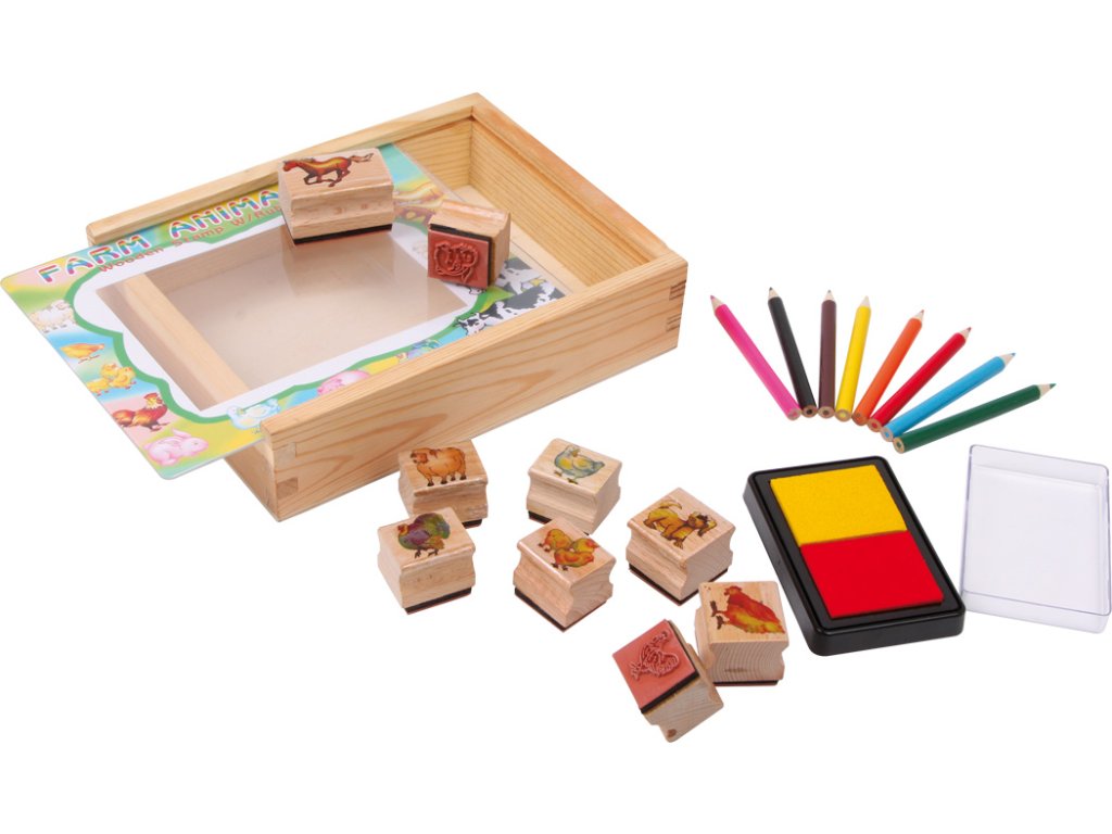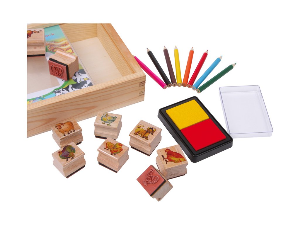 Zvířecí obyvatele farmy se zde pomocí 9 razítek a 2 inkoustovými polštářky octnou na papířeS 8 pastelkami si mohou děti motivy barevně vymalovat