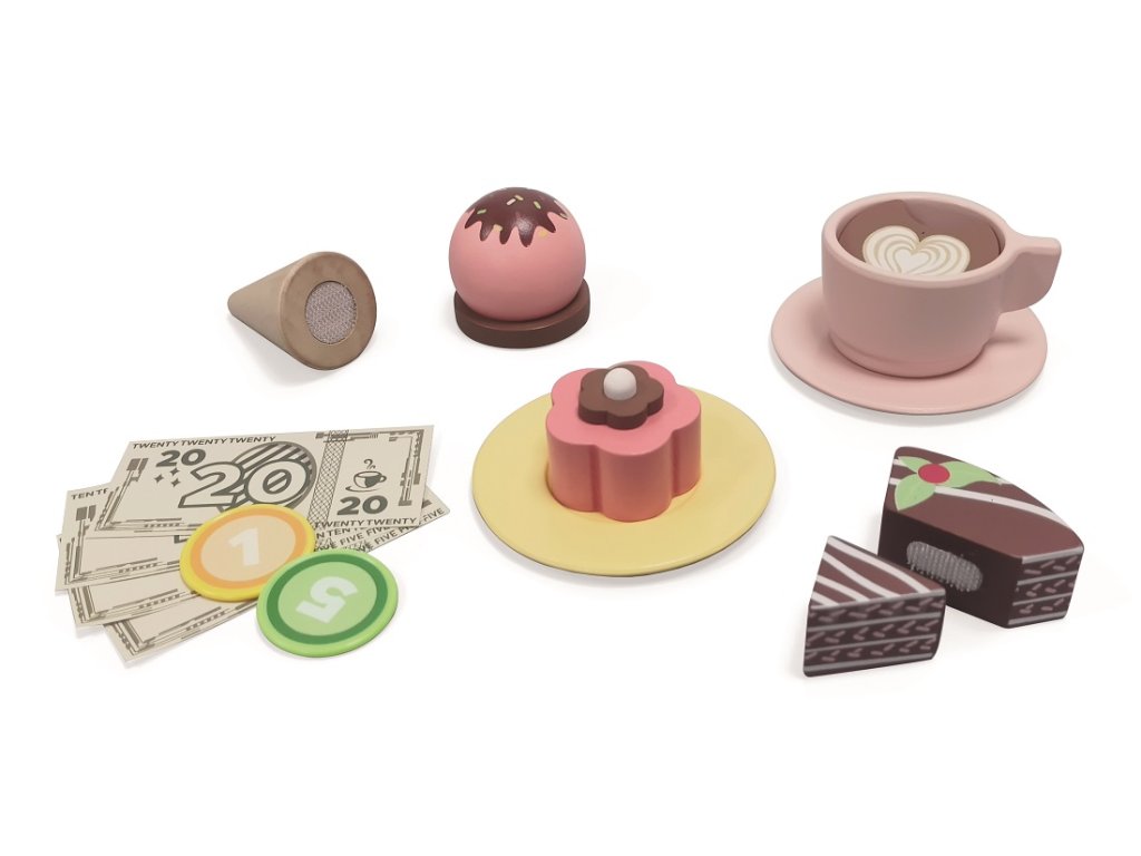 Staň se opravdovým baristou či obchodníkem! Je libo zmrzlinu, dortík nebo jen lahodnou kávu? S touto 46dílnou sadou si užijete hodiny zábavy. Sada nabízí šálky s podšálky, příbory a lžíce, pultík s kávovarem, vitrínou s dortíky a poličkou s díry na zmrzliny. Nechybí ani zásuvky s úložným prostorem pro peníze, které jsou také součástí této sady. Hračky na hraní rolí popouštějí v dětech fantazii a inspirují ke kreativní hře, což má příznivý dopad i na jejich slovní zásobu a rozvoj jazyka.
