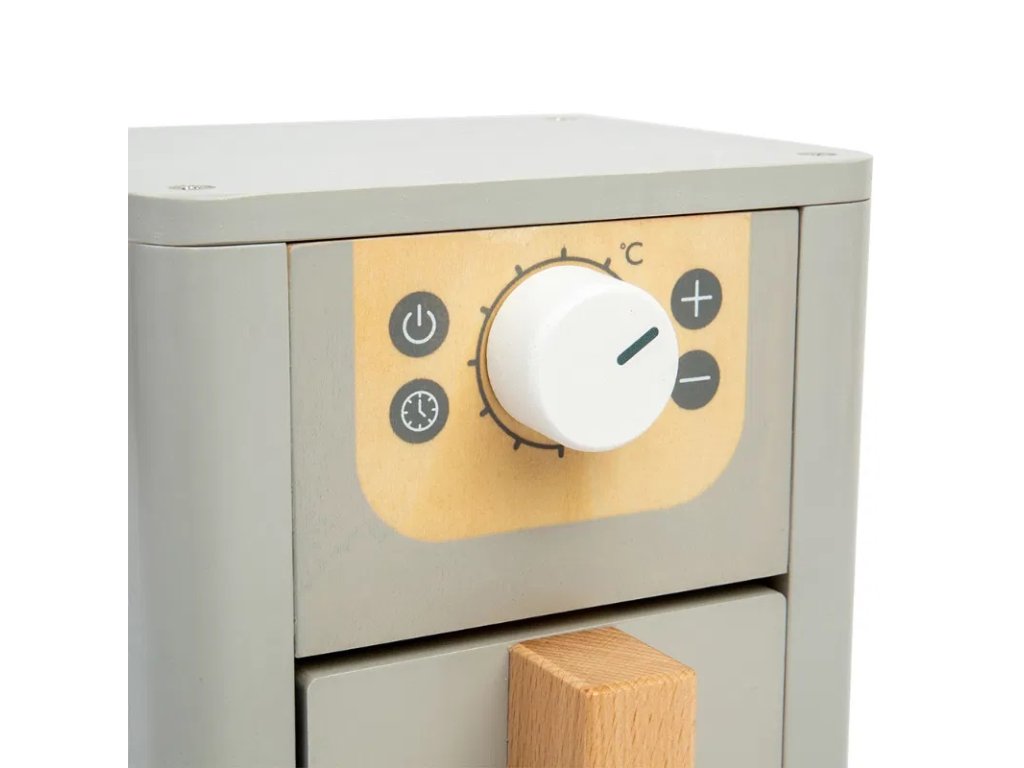 I malé děti mohou mít svou vlastní horkovzdušnou fritézu! Dřevěná fritéza je vybavena otočným knoflíkem pro volení teploty, úložnou zásuvkou pro fritování a pěti dřevěnými potravinami. Součástí je polovina rajčete, kousek květáku, kuřecí palička, plátek lososa a plátek brokolice. Kuchyňský doplněk je vhodný pro rozvoj dětské kreativity, pro rozvoj jemné motoriky a sociálních interakcí. Podporuje nápadité myšlení a pomáhá zlepšovat slovní zásobu hraním si na role. Tato hračka v žádném případě nesmí chybět v žádné dětské kuchyňce! Horkovzdušná fritéza je vyrobena z prvotřídního a udržitelného dřeva s certifikací FSC, barvena je netoxickými barvami a laky a splňuje všechny aktuální evropské bezpečnostní normy.