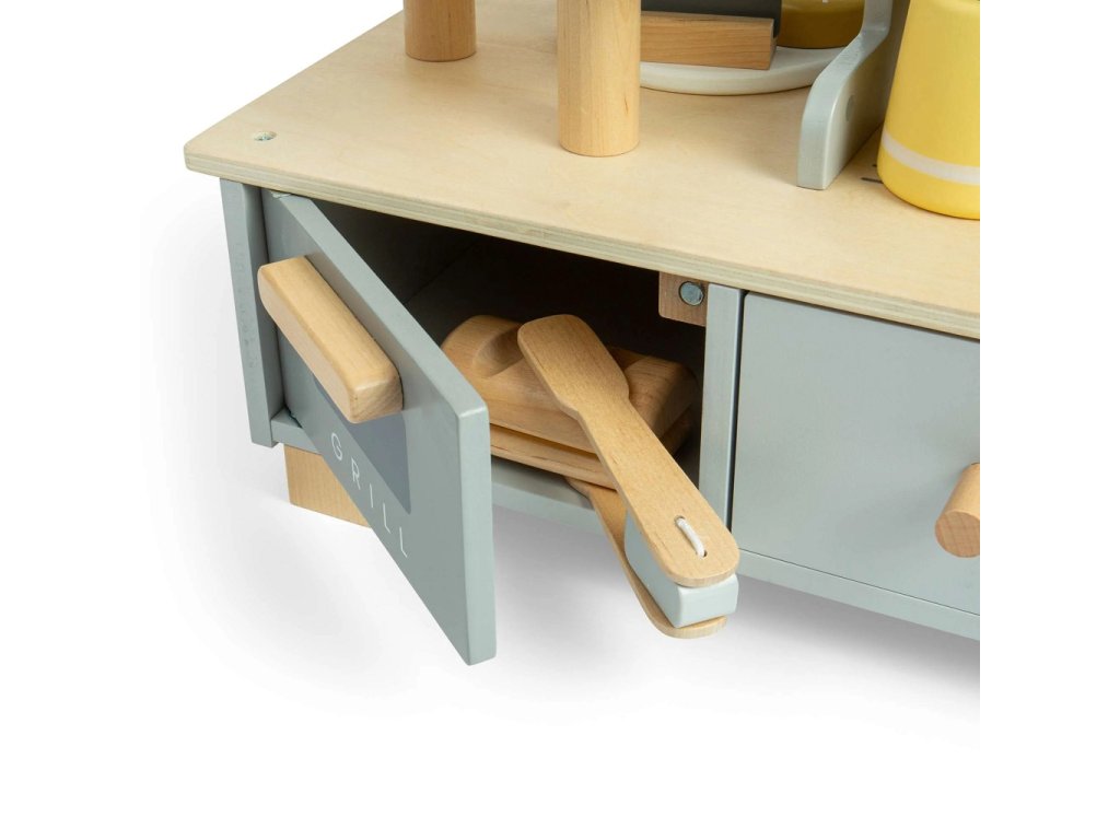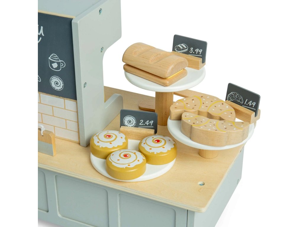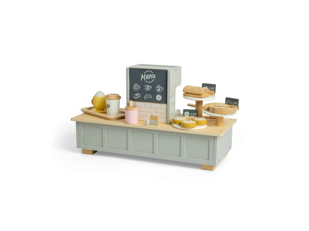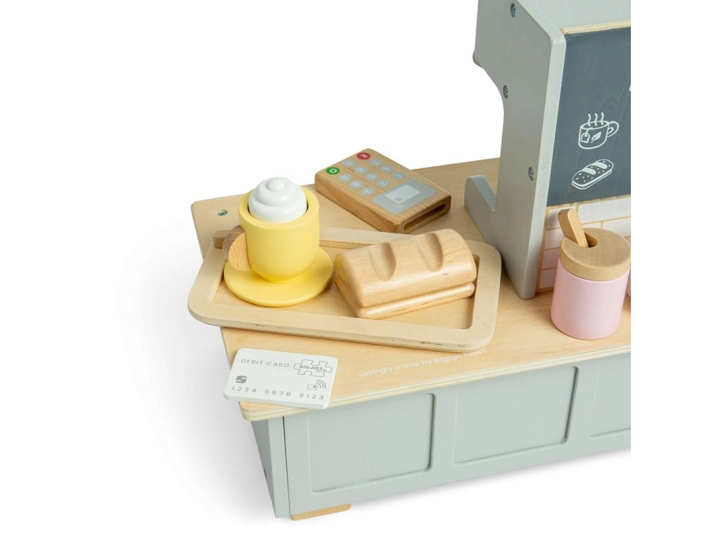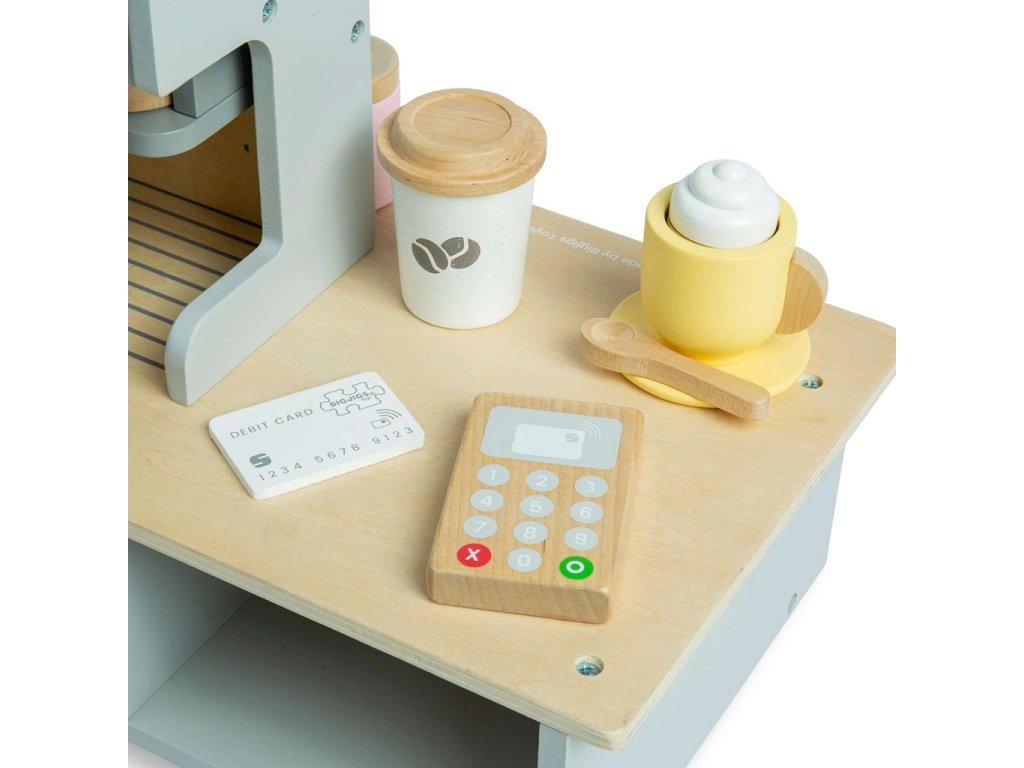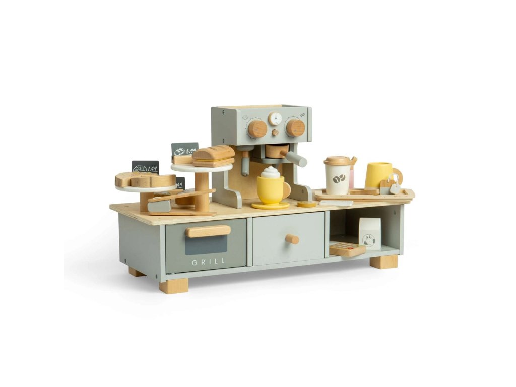 Staň se opravdovým baristou! Je libo latte či cappuccino? S touto 32 dílnou kavárenskou sadou si užijete hodiny zábavy. Sada nabízí kávovar, servírovací pult s grilem a úložnou zásuvkou, doplňky jako jsou chutně vypadající zákusky, sendvič, šálky a podšálky, servírovací podnos, kelímek na kávu s sebou, mléko, čaj a další. Součástí je i dřevěná bankovní karta a terminál na platby jako v opravdové kavárně. Hračky na hraní rolí popouštějí v dětech fantazii a inspirují ke kreativní hře, což má příznivý dopad i na jejich slovní zásobu a rozvoj jazyka. Kavárna je vyrobena z prvotřídního FSC® certifikovaného dřeva. Všechny části jsou obarveny netoxickými barvami a laky. Splňuje všechny aktuální evropské bezpečnostní normy.