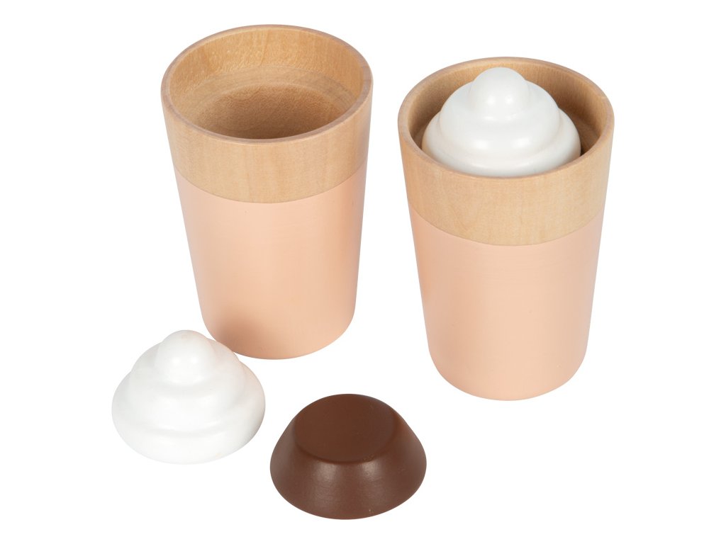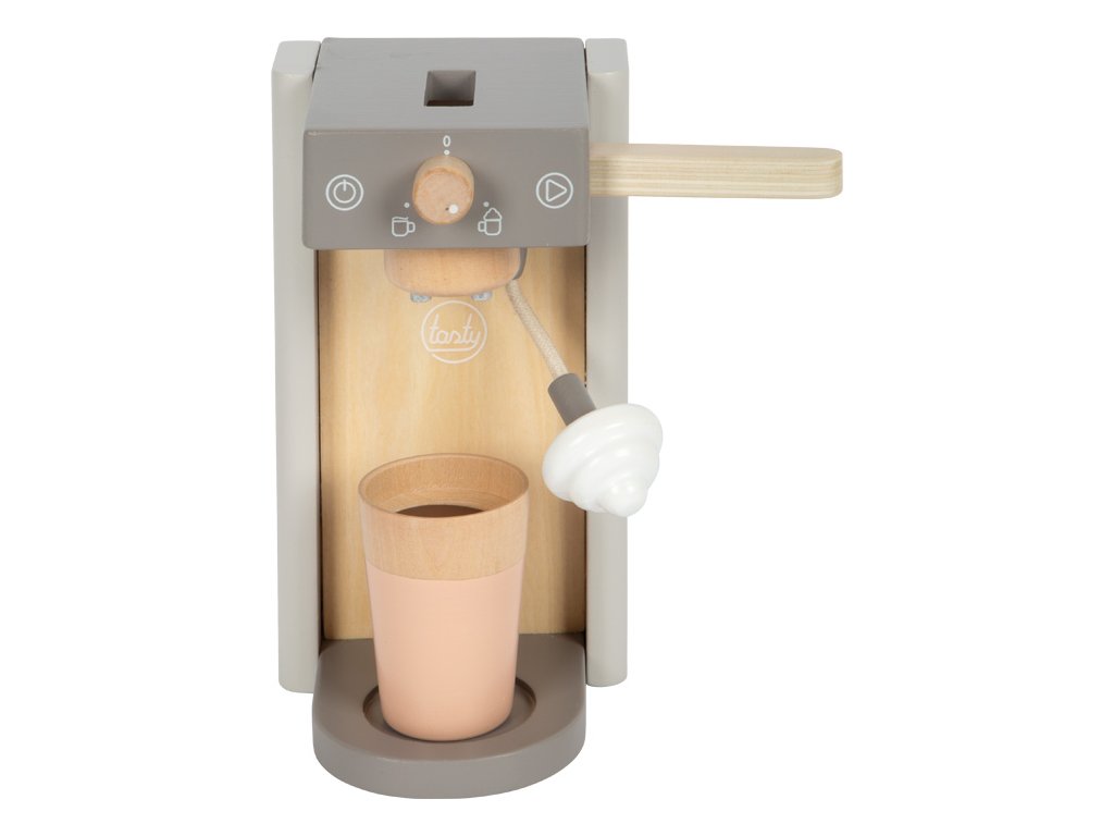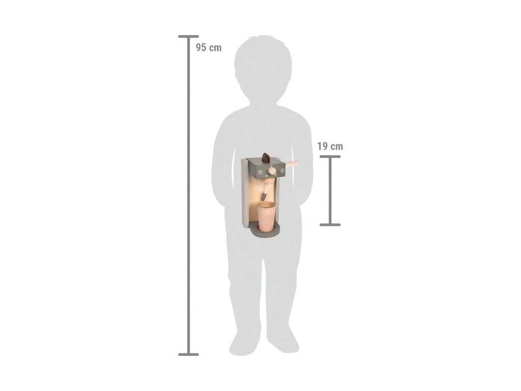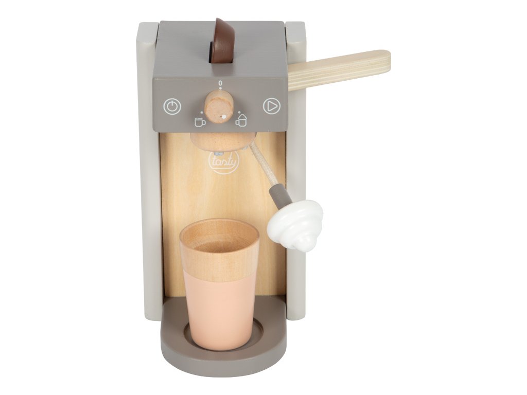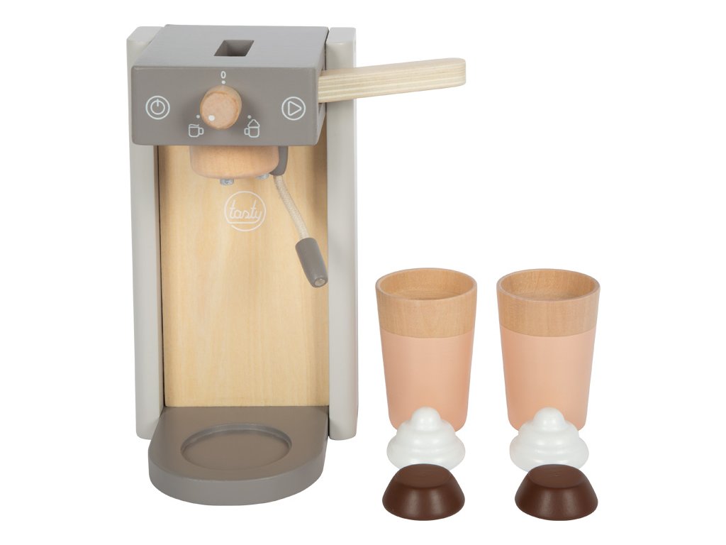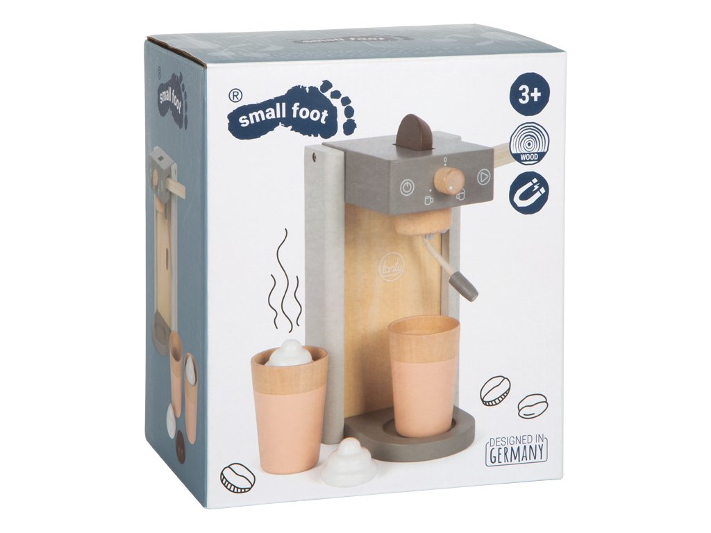 Pro malé baristy a baristky! Tato kompletní dřevěná sada se skládá z dětského kávovaru s 2 kávovými kapslemi, 2 šálky na kávu s sebou a 2 kopečky mléčné pěny. Kávovar nabízí realistickou hru, kávové kapsle zapadnou do přístroje, hotovou kávu můžete nazdobit magnetickou mléčnou pěnou. Kávovar má nenápadné barvy a mnoho viditelného dřeva. Kávové kapsle do kávovaru zapadnou pomocí boční páčky, kuželovitý tvar kelímků zajistí, že kapsle spadne přímo do nich. Magnetický napěňovač vám poskytne mléko do kávy. Napěňovač je vyroben z drátku obaleného v textilu, ohýbá se do všech stran a na konci má magnet, na který můžete připevnit mléčnou pěnu. Tato sada má barevný design kompatibilní s dalšími produkty řady Tasty od small foot, například Dřevěnou kuchyňkou LE12216.