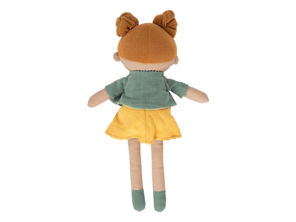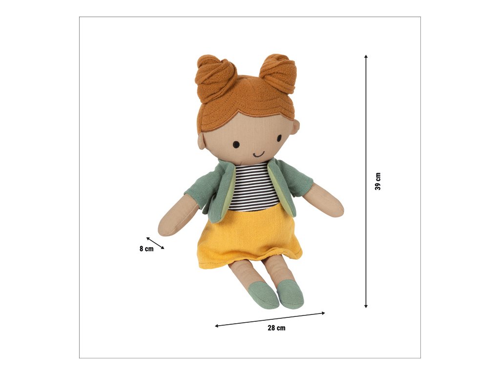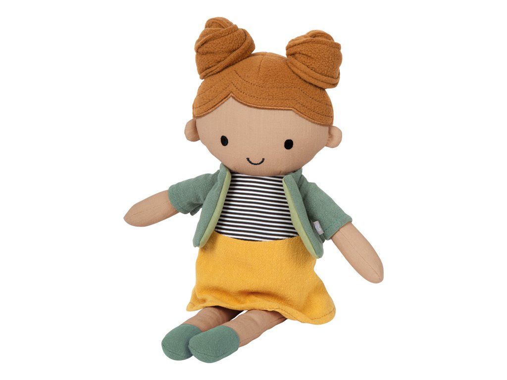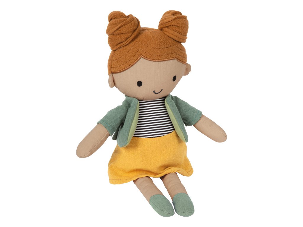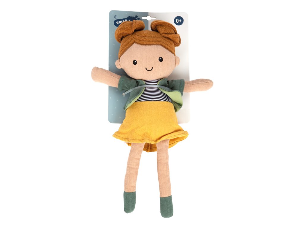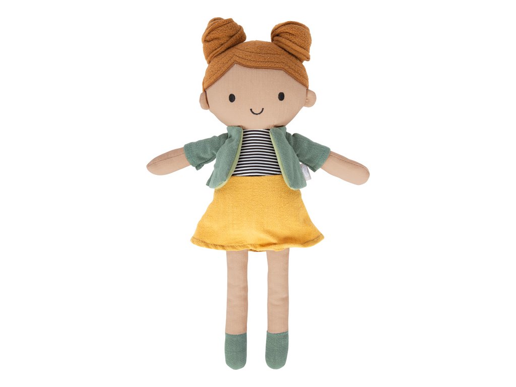 - měkká látková panenka se žlutou sukní, pruhovaným topem a odnímatelnou bundou