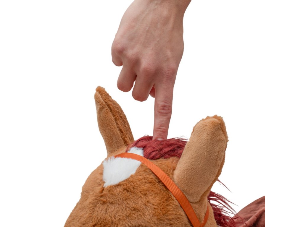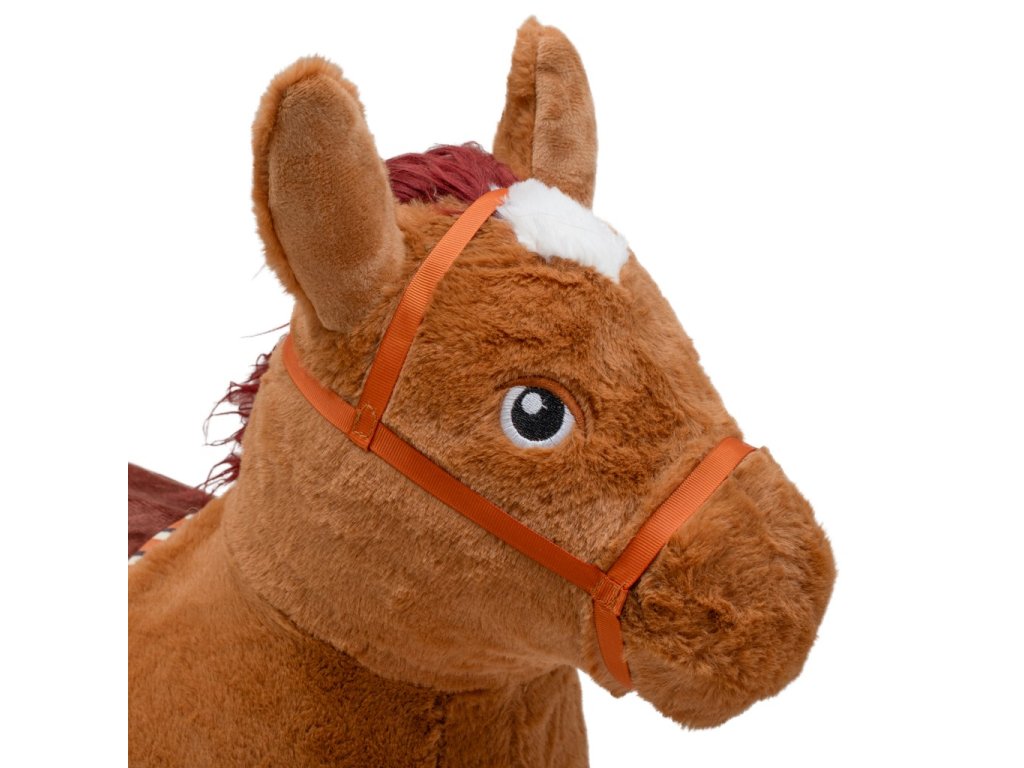 Skákadlo je potaženo měkkým, protiskluzovým plyšem, velmi příjemným na dotek. Je vybaveno zvukovým modulem – po stisknutí mezi oušky vydává realistický zvuk koníka, což podporuje představivost a motivuje k aktivní hře.