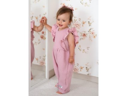 Letní mušelínový overálek pro holčičky s volánkem Star - starorůžová