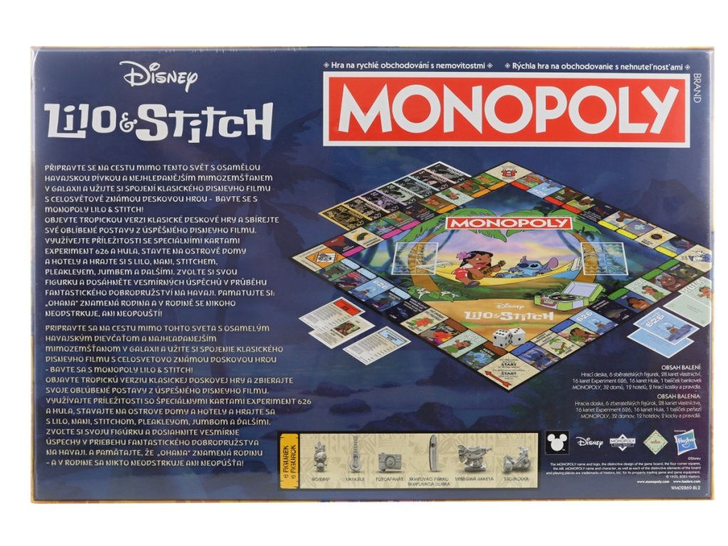 Oblíbená společenská hra Monopoly s motivem Disney pohádky Lilo & Stitch. Připravte se na cestu mimo tento svět s osamělou havajskou dívkou a nejhledanějším mimozemšťanem v galaxii a užijte si spojení klasického Disneyho filmu s celosvětově známou deskovou hrou. Rozměry balení 40x27x5,5 cm. Určeno pro 2-6 hráčů. Doporučený věk 8+Doplňkové parametry