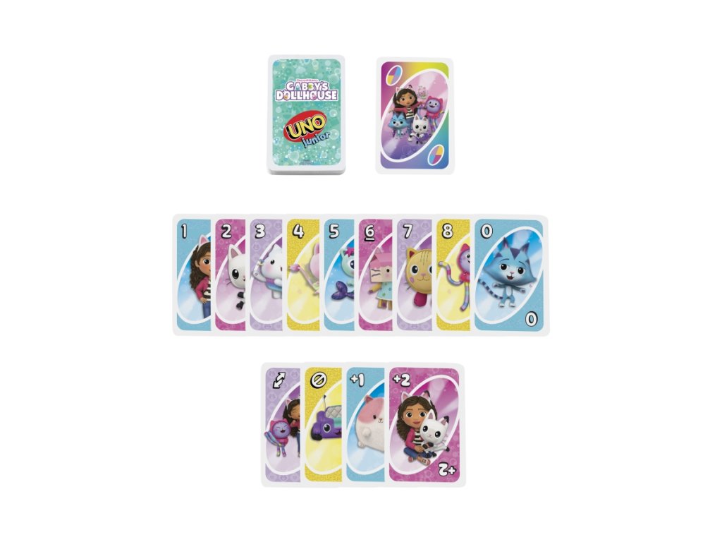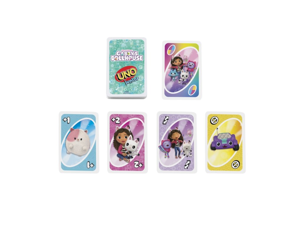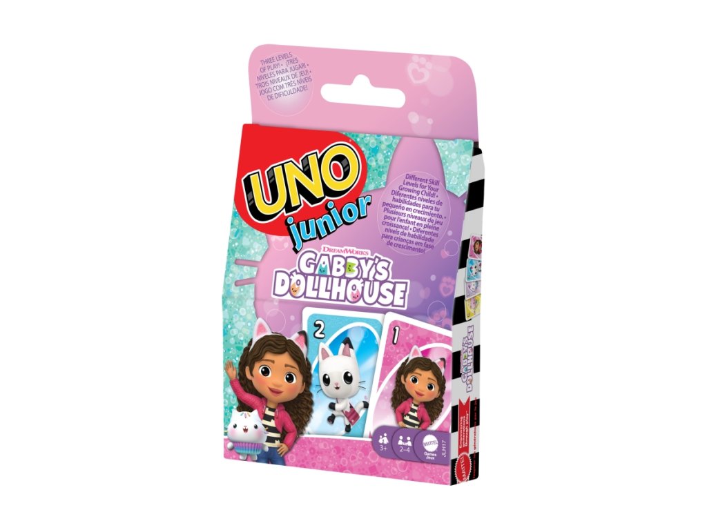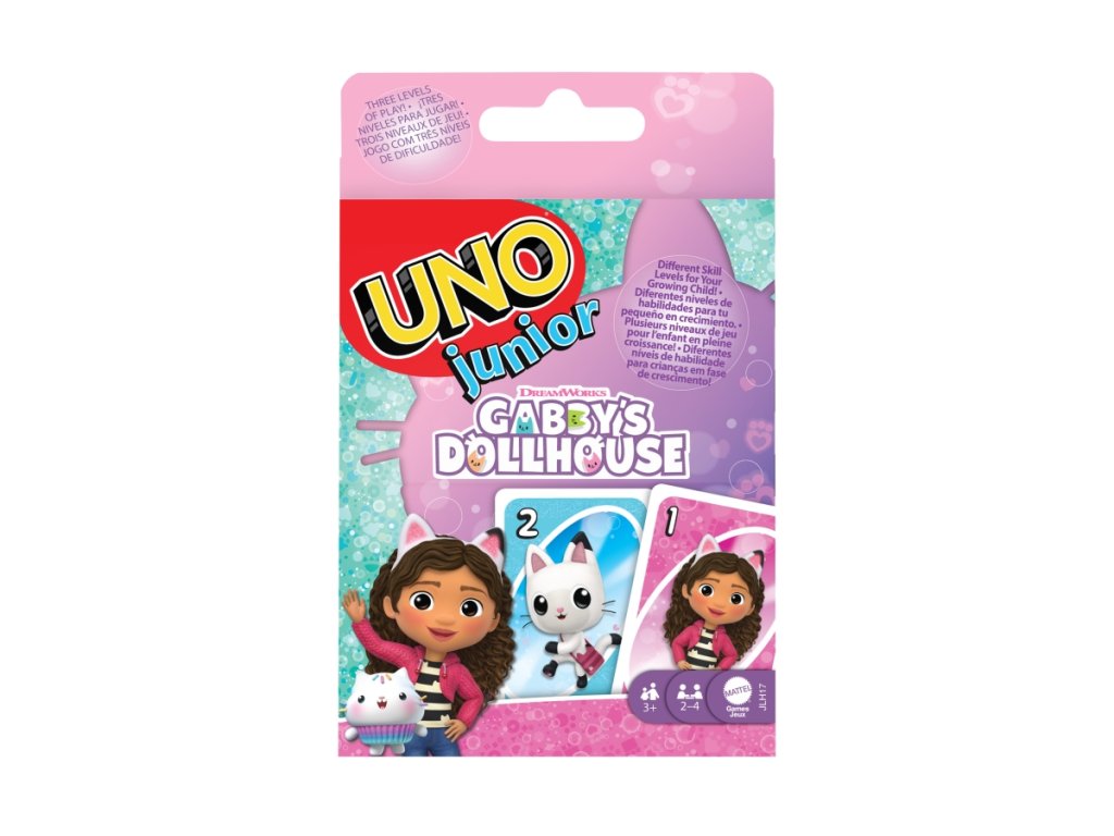 Kočičí verze oblíbené karetní hry UNO Junior s motivy postaviček z animovaného seriálu Gabby’s Dollhouse od DreamWorks přináší spoustu zábavy pro malé hráče. Hraje se podle klasických pravidel – hráči se snaží zbavit všech karet postupným přikládáním podle barvy nebo čísla. Tato edice obsahuje tři úrovně obtížnosti – začátečník, střední a pokročilý – které se přizpůsobí dovednostem dítěte. Když zbývá poslední karta, nesmí chybět výkřik „UNO!“. Speciální grafické symboly na každé kartě navíc pomáhají rozlišit barvy, takže si hru mohou užít i hráči s jakoukoli formou barvosleposti. Barvy a vzhled karet se mohou lišit. Věk 3+Doplňkové parametry