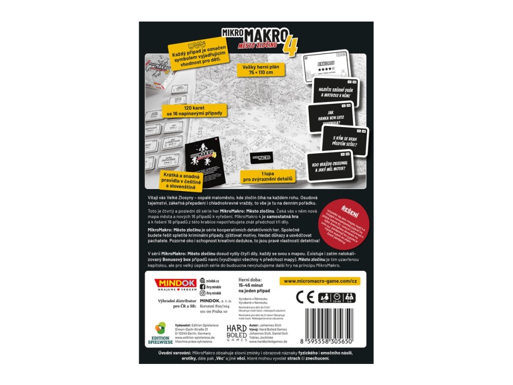 Vítají vás Velké Zlosyny – ospalé maloměsto, kde zločin číhá na každém rohu. Osudová tajemství, zákeřná přepadení i chladnokrevné vraždy, to vše je tu na denním pořádku. Toto je čtvrtý a poslední díl série her MikroMakro: Město zločinu. Čeká vás v něm nová mapa města a nových 16 případů k vyřešení. MikroMakro 4 je samostatná hra a k řešení 16 případů z této krabice nepotřebujete znát předchozí tři díly. MikroMakro: Město zločinu je série kooperativních detektivních her. Společně budete řešit spletité kriminální případy, zjišťovat motivy, hledat důkazy a usvědčovat pachatele. Pozorné oko i schopnost kreativní dedukce, to jsou pravé vlastnosti detektiva! Určeno pro 1-4 hráče. Věk 12+Doplňkové parametry