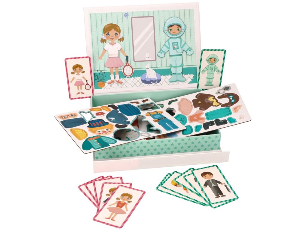 Magnetické puzzle "Profese" zabalené v estetické a pohodlné krabičce.Skládá se z 12 karet s obrázky dívek a chlapců a 74 magnetických prvků oblečení a doplňků.