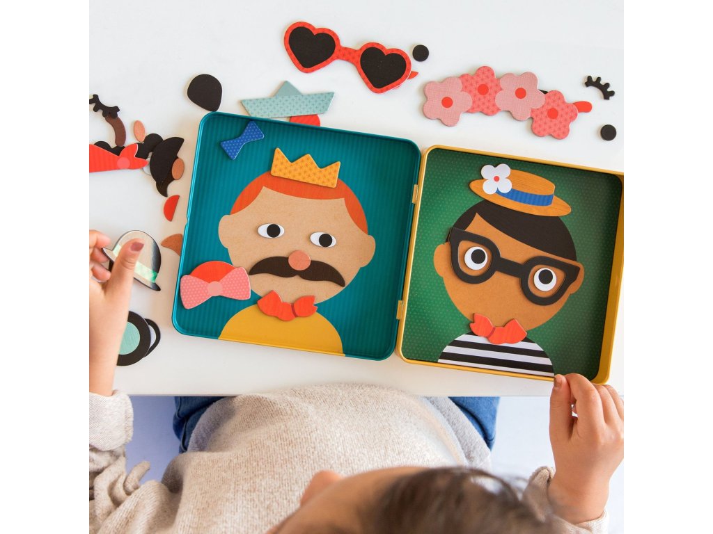 Stavějte a kombinujte vtipně ilustrované tváře do různých scén. K dispozici je řada magnetických částí obličejů a jejich doplňků, které se scénami ve vnitřních prostorách odolné kovové krabičky tvoří praktickou sadu na cesty. Hra nabízí až 100 možných kombinací nabízejících velký prostor vlastní fantazii. Hlavní vlastnosti: 25 dílků, 2 pozadípraktické baleníDoplňkové parametry