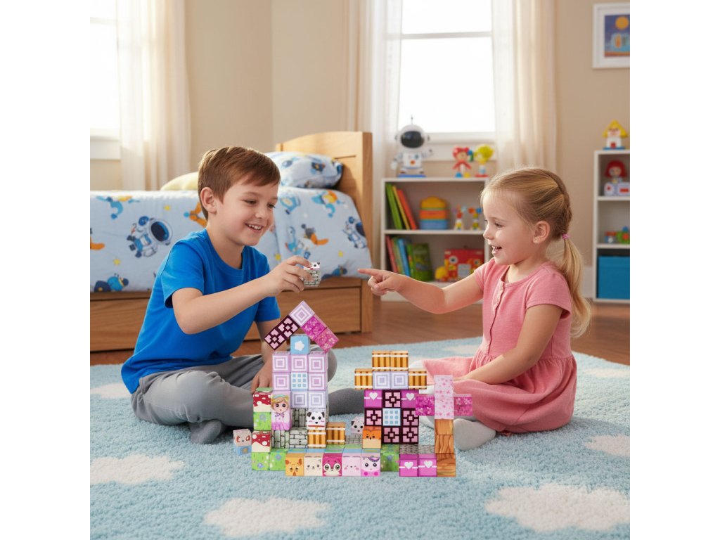 Díky 113 barevným kostkám s vestavěnými magnety může každé dítě samostatně stavět věže, tvary a prostorové konstrukce bez obtíží a frustrace.