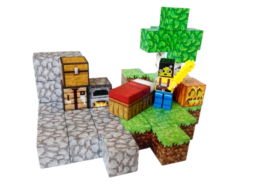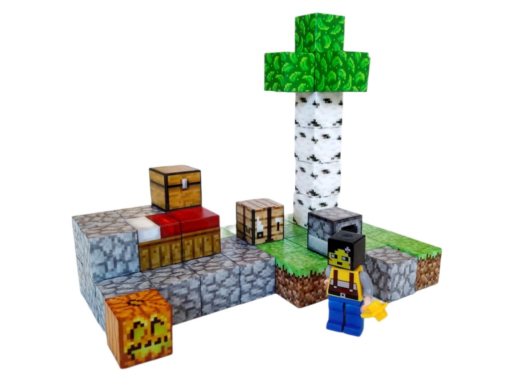 Kostky mají kvalitní potisk, který napodobuje textury z Minecraftu – trávu, kámen, dřevo nebo dýni. Materiál je bezpečný, netoxický a vhodný pro děti od 3 let. Díky magnetům je manipulace snadná i pro malé děti a zároveň podporuje jemnou motoriku a prostorovou představivost.