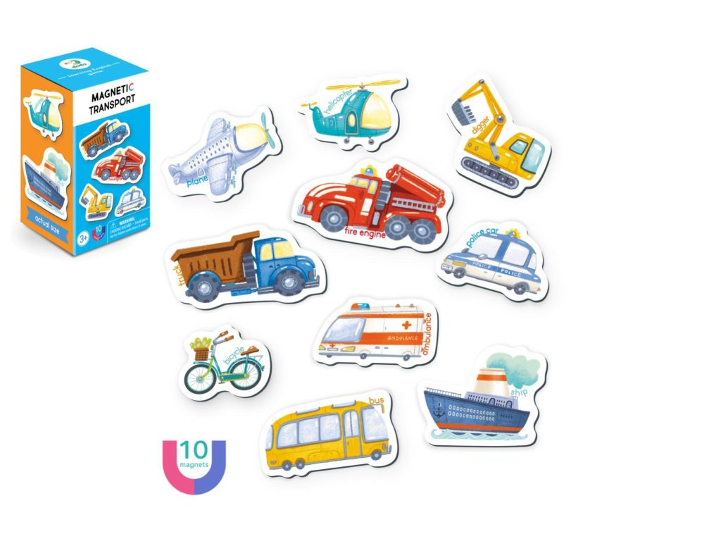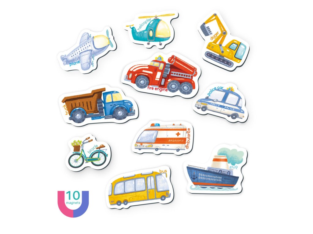 Tato sada magnetů s motivem dopravních prostředků obsahuje poutavé obrázky s anglickými názvy, které budou inspirací pro nekonečné hodiny kreativní hry, ale také dopomocí při učení angličtiny.Balení obsahuje 10 kusů