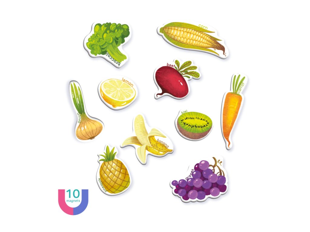 Tato sada magnetů s motivem ovoce a zeleniny obsahuje poutavé obrázky s anglickými názvy, které budou inspirací pro nekonečné hodiny kreativní hry, ale také dopomocí při učení angličtiny.Balení obsahuje 10 kusů