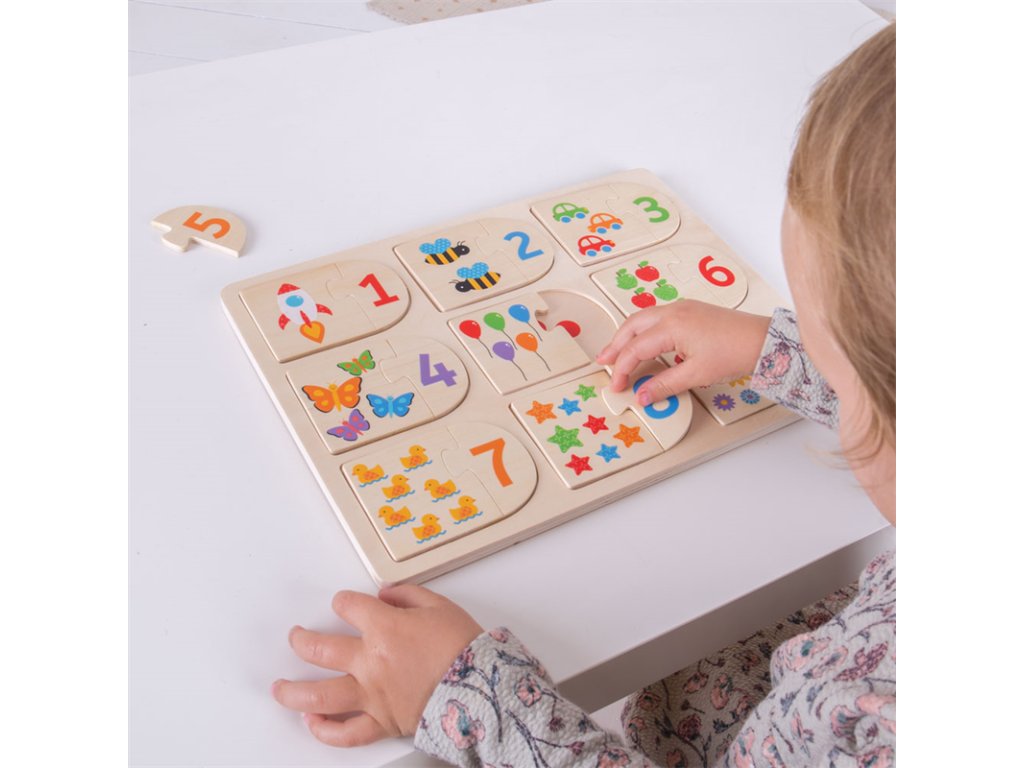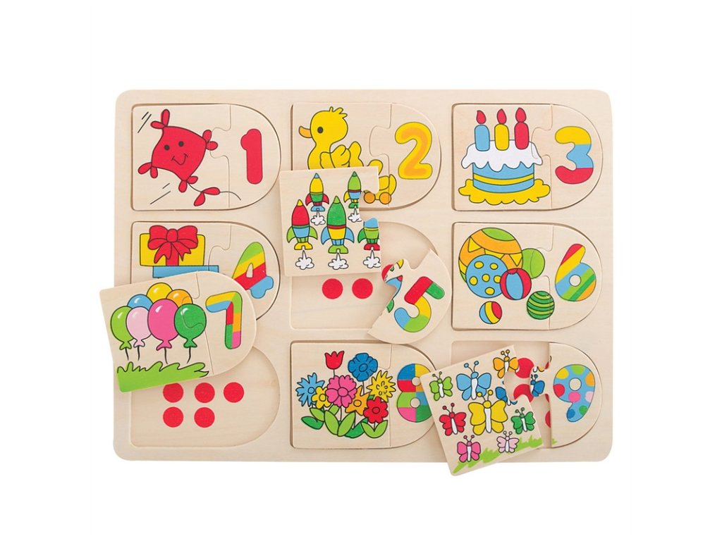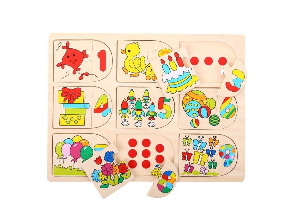 Vaši malí zvědavci budou určitě milovat tohle malé, zajímavé a chytré puzzle. Nejen, že je bude bavit třídit kousky do správných míst, ale mohou vkládat jen samotné obrázky a k nim pak přiřadit ta správna čísla. Každý kousek dřevěné skládačky je dimenzovaný tak, aby usnadnil zvedání, uchopení v malé dětské ručičce. Puzzle jsou potištěny obrázky nebo barvami, které napomáhají procesu učení a dodávají vzdělávací hodnotu. Skvělý způsob, jak rozvíjet obratnost, rozpoznávání tvarů, koncentraci a počítání již od útlého věku. Hlavní vlastnosti: vyrobeno z vysoce kvalitních materiálů ze zodpovědných zdrojůodpovídá současným evropským bezpečnostním normámDoplňkové parametry