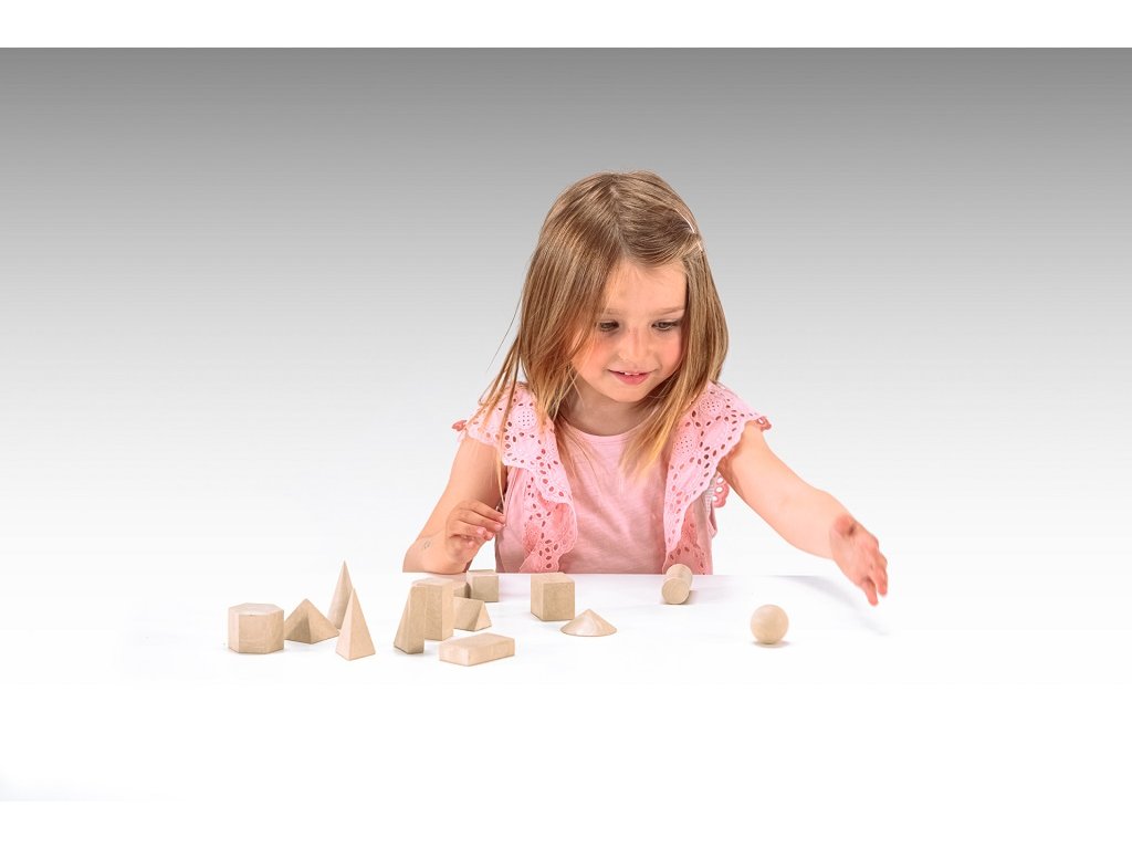14 různých dřevěných geometrických těles, které slouží ke hraní, ale jsou vhodné také jako učební pomůcka. Rozpoznáte a pojmenujete je správně všechny? Díky těmto kostkám získá dítě pojem o slovech jako je plocha, hrana, roh, strana, úhlopříčka, úsečka, pravý úhel či kolmice. Ukažte mu, jak vypadá krychle, kvádr, hranol, válec, jehlan, kužel či koule. Vyrobeno ze 100% recyklovaných materiálů, má certifikaci PEFC a po použití jej lze opakovaně recyklovat.
