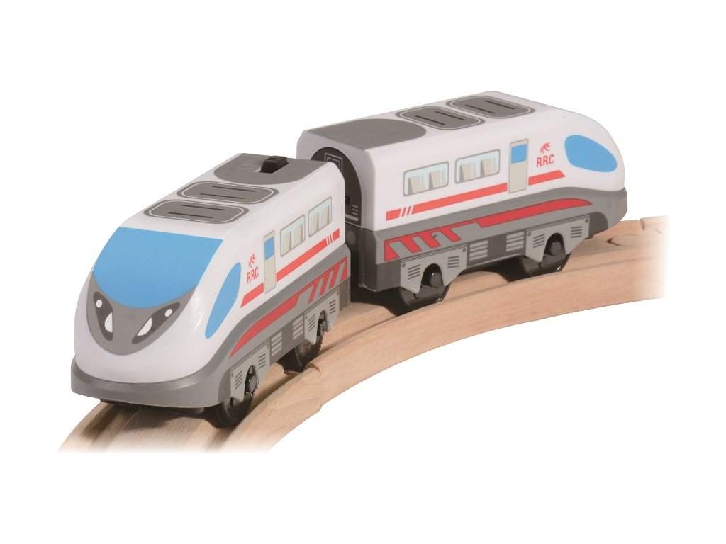 Moderní vysokorychlostní vlak na baterie v elegantním designu potěší každého malého fanouška železnice! Stylová modro-bílá souprava s realistickými detaily je ideální pro všechny děti, které milují rychlá vozidla. Lokomotiva je poháněná bateriemi a dokáže jezdit sama, takže přináší ještě víc zábavy a akce. Pomocí magnetu je propojena s vagonkem – jejich spojení je jednoduché, a děti tak mohou snadno vlak rozpojit i složit. Vlak je plně kompatibilní s běžnými dřevěnými vláčkodráhami, takže ho snadno zařadíte do již existujících herních světů. Skvělá volba pro rozvoj jemné motoriky, koordinace pohybů a dětské fantazie.