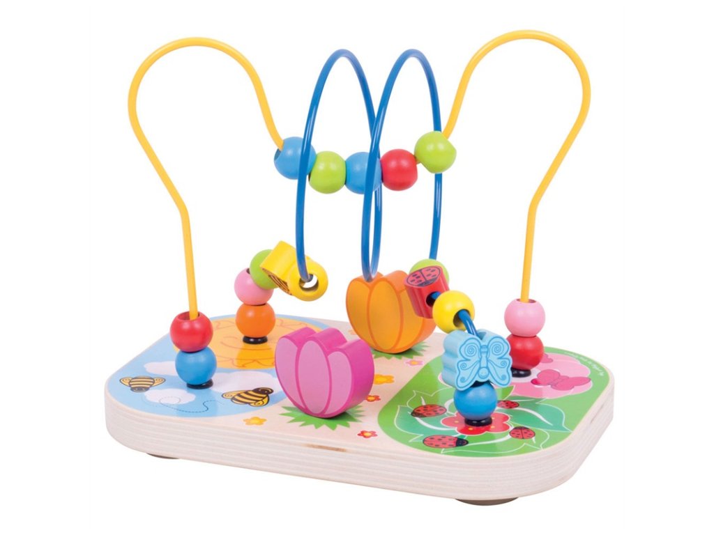 Podpořte zručnost dětí s tímto motorickým labyrintemDěti mohou posouvat barevné korálky s tematikou přírody po barevných drátcích, to vše se děje nad dvěma barevnými květinami