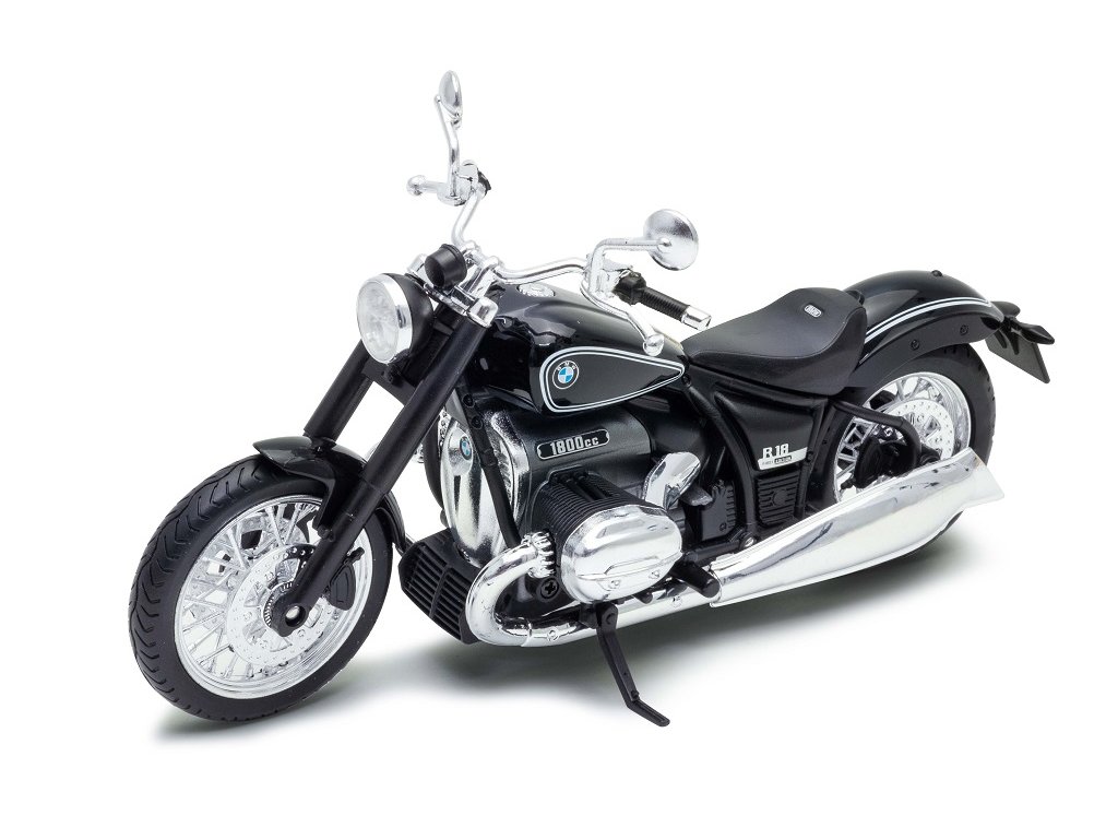 Miniatura motocyklu BMW R18 z kovu a plastu má otočná řídítka a odpruženou zadní vidlici. Model je dodáván s podstavcem, na který je upevněn šroubem. Dodáváno v různobarevné papírové krabičce s plastovým průhledem.