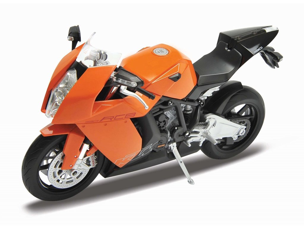 Detailní model motocyklu KTM 1190 RC8 z kovu a plastu má otočná řídítka a odpruženou zadní vidlici. Dodáváno v různobarevné papírové krabičce s plastovým průhledem. Hlavní vlastnosti: kovová karoserieotočná řídítkaodpružená zadní vidliceDoplňkové parametry