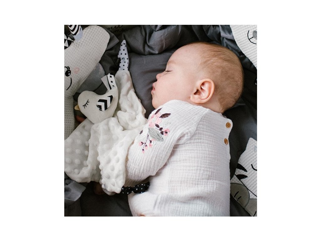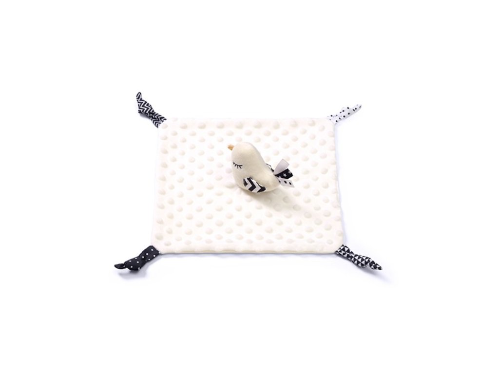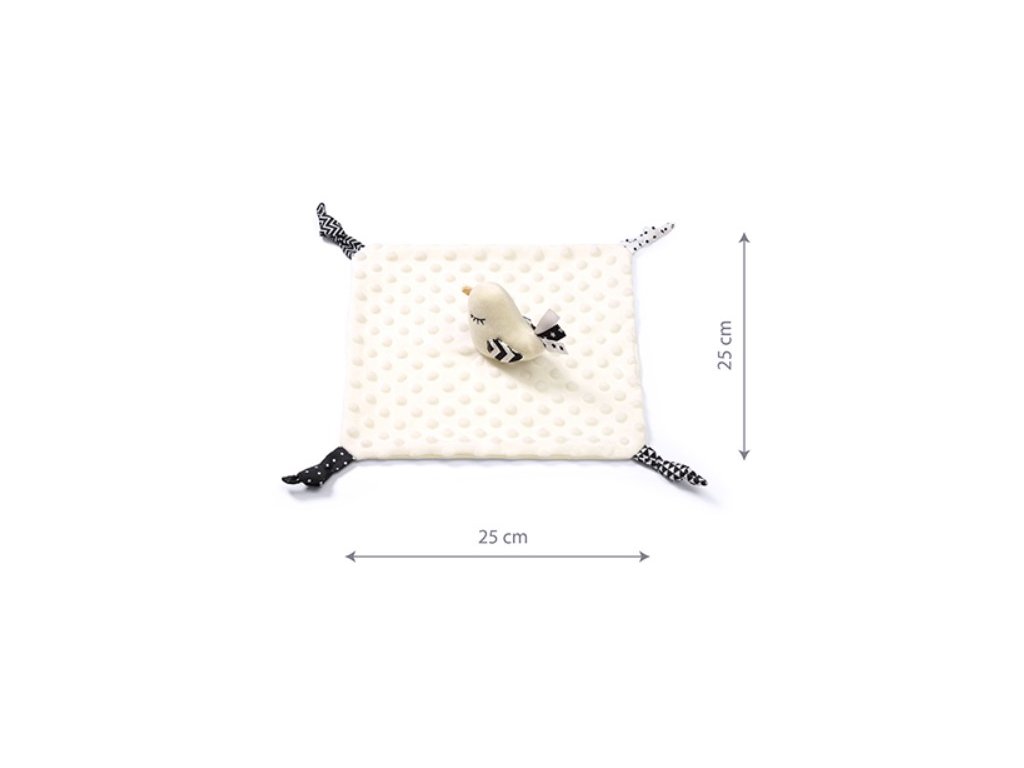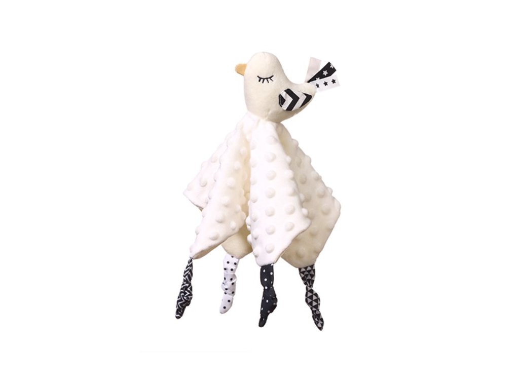 Přítulníček mazlíček/šustík, Bird.Little Birdie je funkční produkt dva v jednom: deka a plyšová hračka. Je to také vzdělávací hračka. Rozvíjí smysly miminka od prvních dnů života. Minky bavlněný materiál má texturu s drobnými cvočky, které stimulují hmat. Podobně měkké uzly nebo stuhy podporují úchopová cvičení. Materiál je vzdušný a jemný.