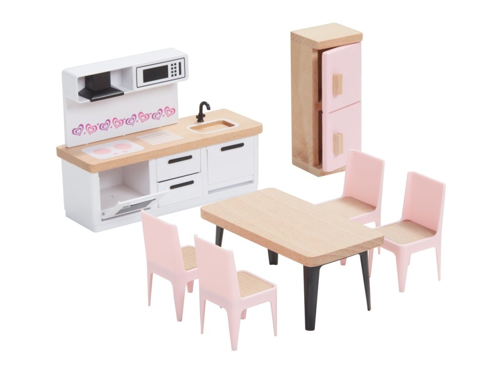Skvělá sada dřevěného nábytku, díky které si můžete vybavit jakýkoli domeček. 5 v 1, to je ložnice, kuchyně, obývací pokoj, dětský pokoj,koupelna a k tomu i celá rodinka. Nádherně detailní dřevěné kousky pomohou mladým představám znovu a znovu vytvářet okouzlující interiérové scény. Skládá se z 36 kusů. Žádný domeček pro panenky není kompletní bez této sady!