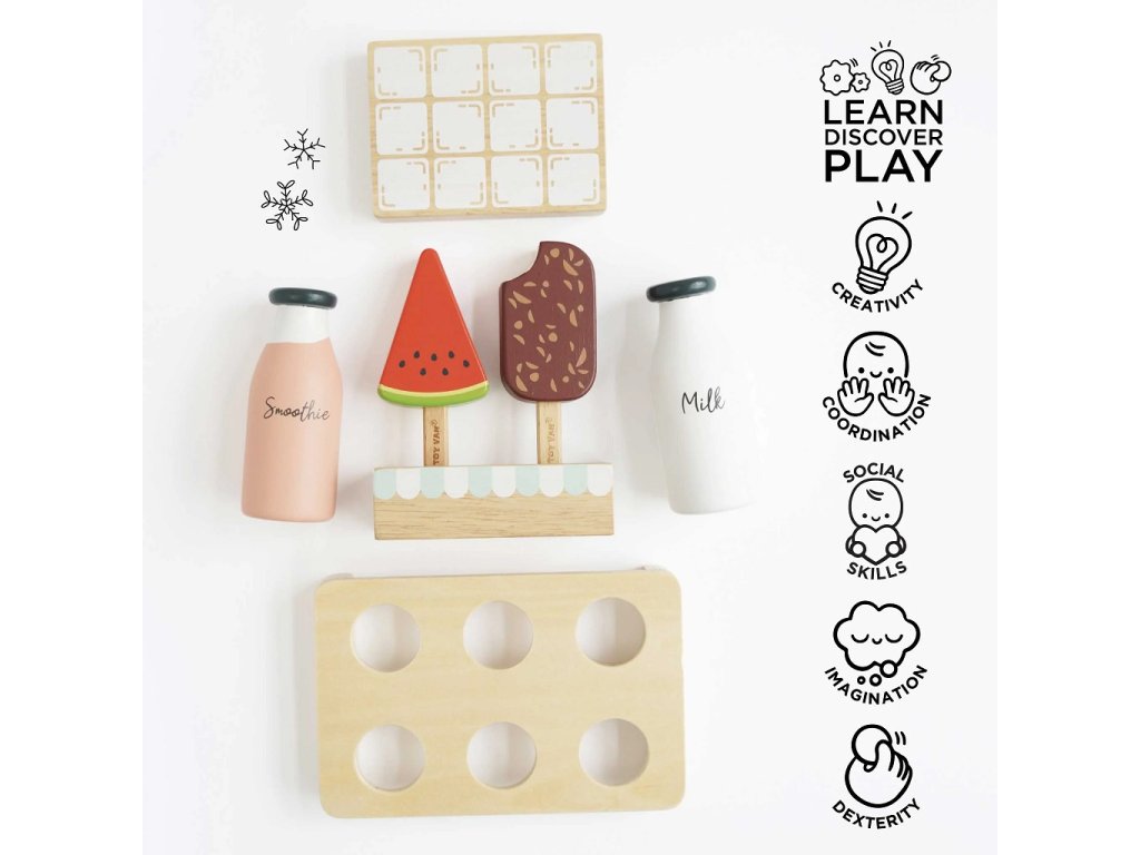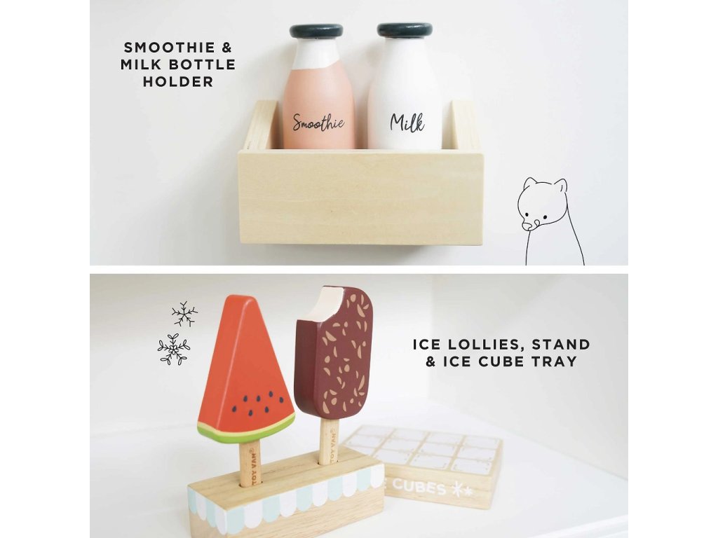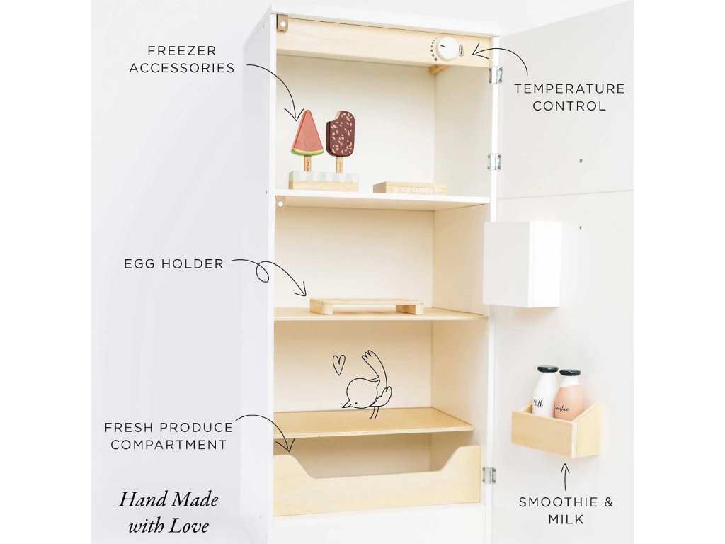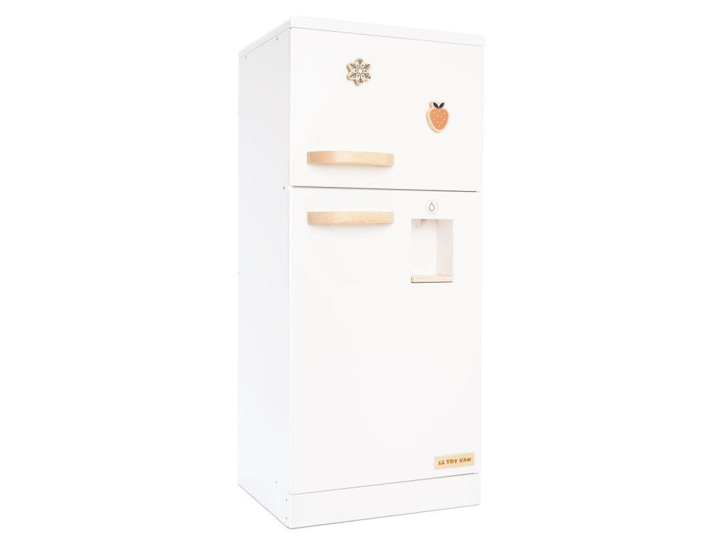 Vylepšete svou kuchyňku touto úžasnou volně stojící lednicí s mrazákem! Odolná hračka s lákavým retro designem je plná interaktivních funkcí pro větší zábavu a víc nápadité hraní rolí. Objevte vestavěný dávkovač vody, ovládání teploty či přihrádky na ovoce a zeleninu. Kompletní set přichází také s řadou příslušenství včetně 2 nanuků, stojanu, tácků na vejce a led a láhve na mléko či smoothie. Dveře ledničky jsou magnetické a navíc jsou zde dva praktické, zdobné magnety. Lednice je kompatibilní s velkou kuchyní Le Toy Van (kód TV347). Sada je vyrobena ze dřeva s certifikací FSC® (dřevo z lesů obhospodařovaných udržitelným způsobem) a zdobena barvami na vodní bázi bezpečnými pro děti. Hračky s účelemVšechny hračky firmy Le Toy Van jsou vyrobeny s cílem – aby dlouho vydržely. Designovány s láskou zkušenými řemeslníky za použití etických praktik a udržitelných materiálů, které jsou laskavější k naší planetě. Hlavní vlastnosti: vyrobeno eticky z FSC udržitelného dřevamalováno netoxickými barvami na bázi vodytestováno dle nejpřísnějších standardůobsahuje lednici s mrazákem, 2 magnety, tác na ledové kostky, tác na vejce, 2 nanuky, 2 láhve, dávkovač vodyinspiruje k nápadité hře Značka a certifikát FSC® (Forest Stewardship Council) zaručuje, že dřevo, ze kterého byl produkt vyroben, nebylo vytěženo nelegálně a pochází z lesů obhospodařovaných šetrným či přírodě blízkým způsobem, ve kterém jsou dodržovány přísné environmentální a sociální požadavky. Značka FSC® na výrobku znamená, že svým nákupem pomáháte chránit lesy a podporujete šetrné, odpovědné či přírodě blízké hospodaření, díky kterému jsou naše lesy stabilnější, zdravější, mají přirozenou druhovou skladbu a lépe odolávají negativním následkům klimatických změn.Doplňkové parametry