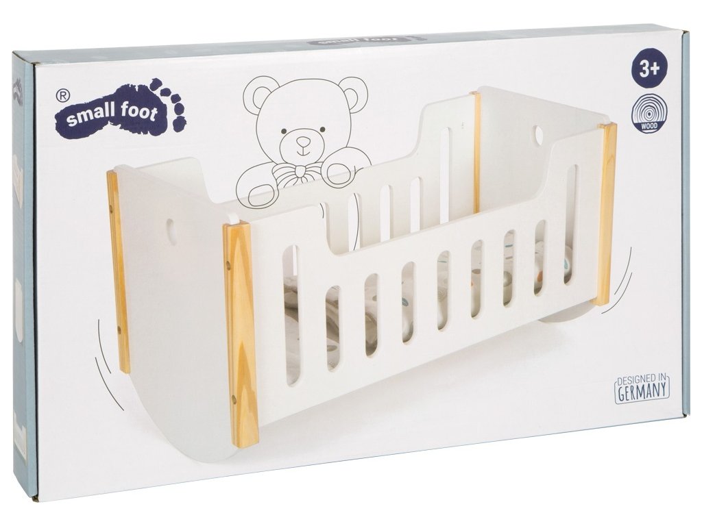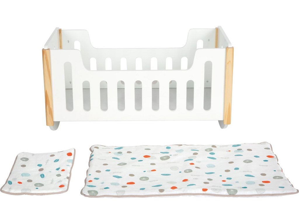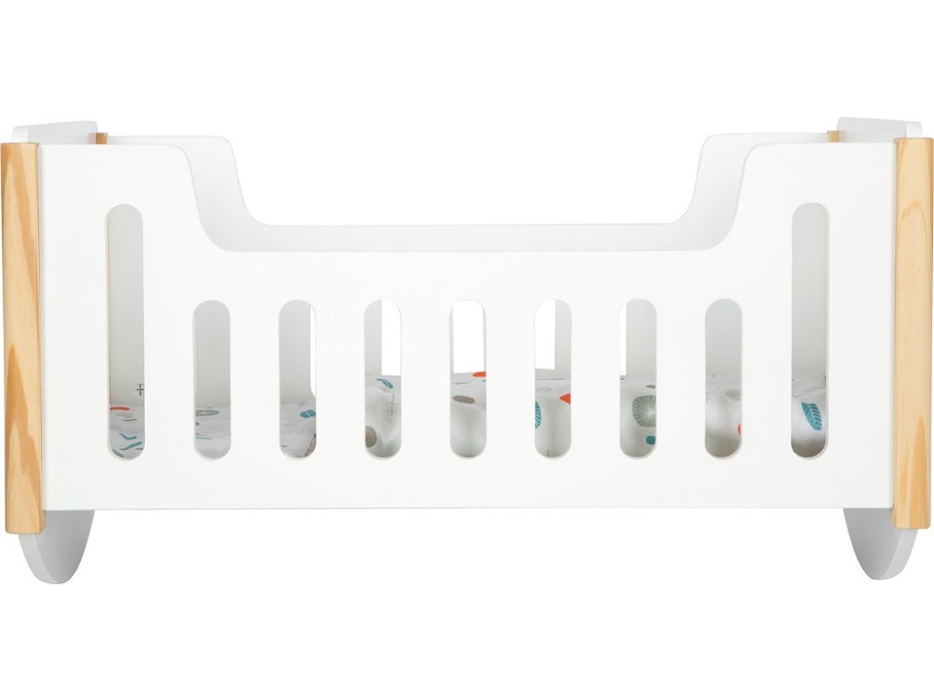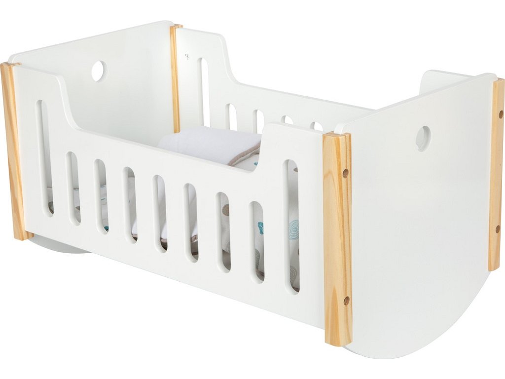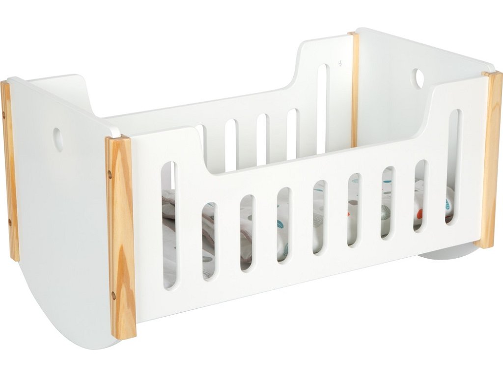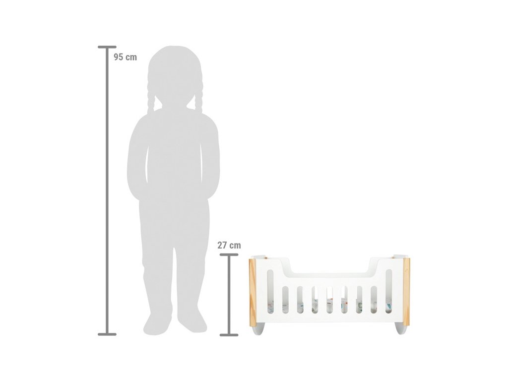 Tato moderní dřevěná kolébka ve skandinávském designu je ideální postýlkou s možností jemného houpání panenek či plyšových zvířátek. Součástí balení je polštář a velká peřinka, které jsou povlečené do barevně neutrálního oboustranného povlečení. Navíc je peřinka dostatečně velká, aby pod ní pohodlně mohly spát panenky nebo plyšáci do velikosti 46 cm. Vysoce kvalitní, stabilní konstrukce, zaoblené hrany, jemné barevné tóny činí z kolébky stylový a kvalitní kousek. Perfektní hračka do každého dětského pokoje.