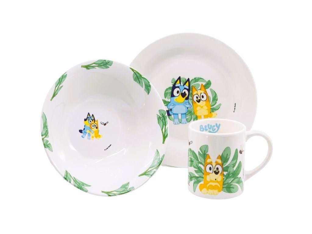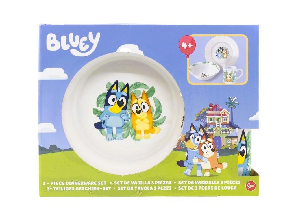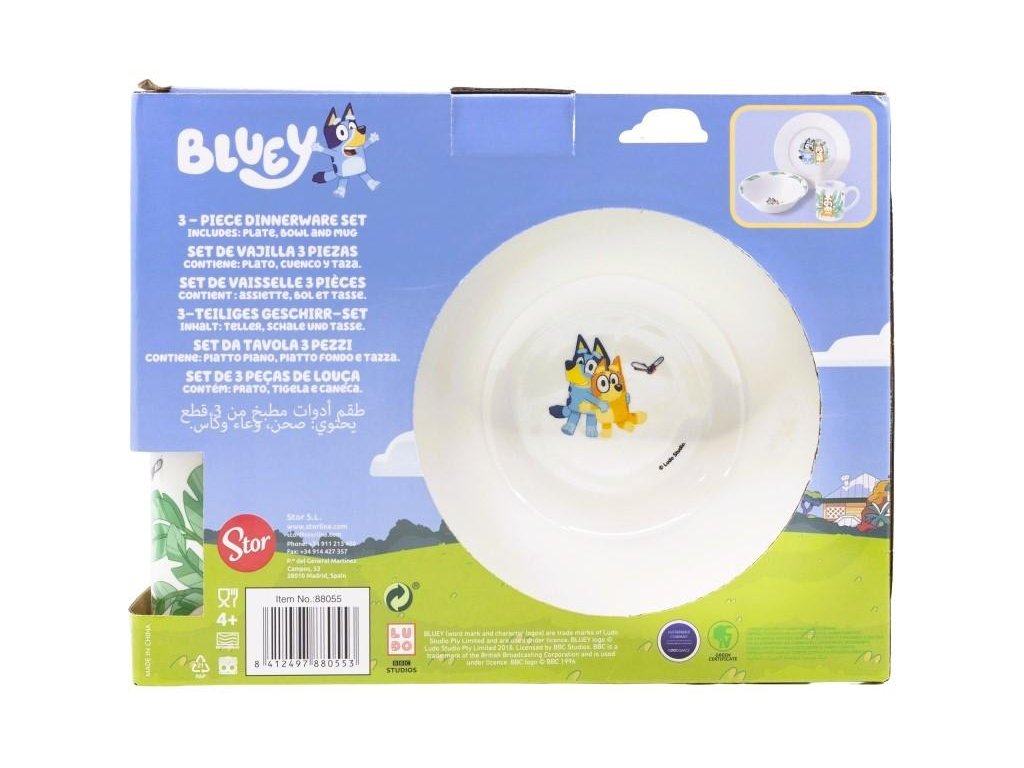 3 - keramická souprava s motivem Bluye. Obsahuje: hrneček, objem 250 ml mělký talíř - průměr 190 cm hluboký talíř (miska) - průměr 19 cm, hloubka 6 cm. Materiál: keramika vhodný do mikrovlnné trouby vhodný do myčky na nádobí Vhodné pro děti od 4 let. Baleno v dárkovém kartonovém obalu. Výrobce: Stor. Stor, S.L.P. General Martínez Campos 5328010 Madrid, Spain info@storline.comDoplňkové parametry